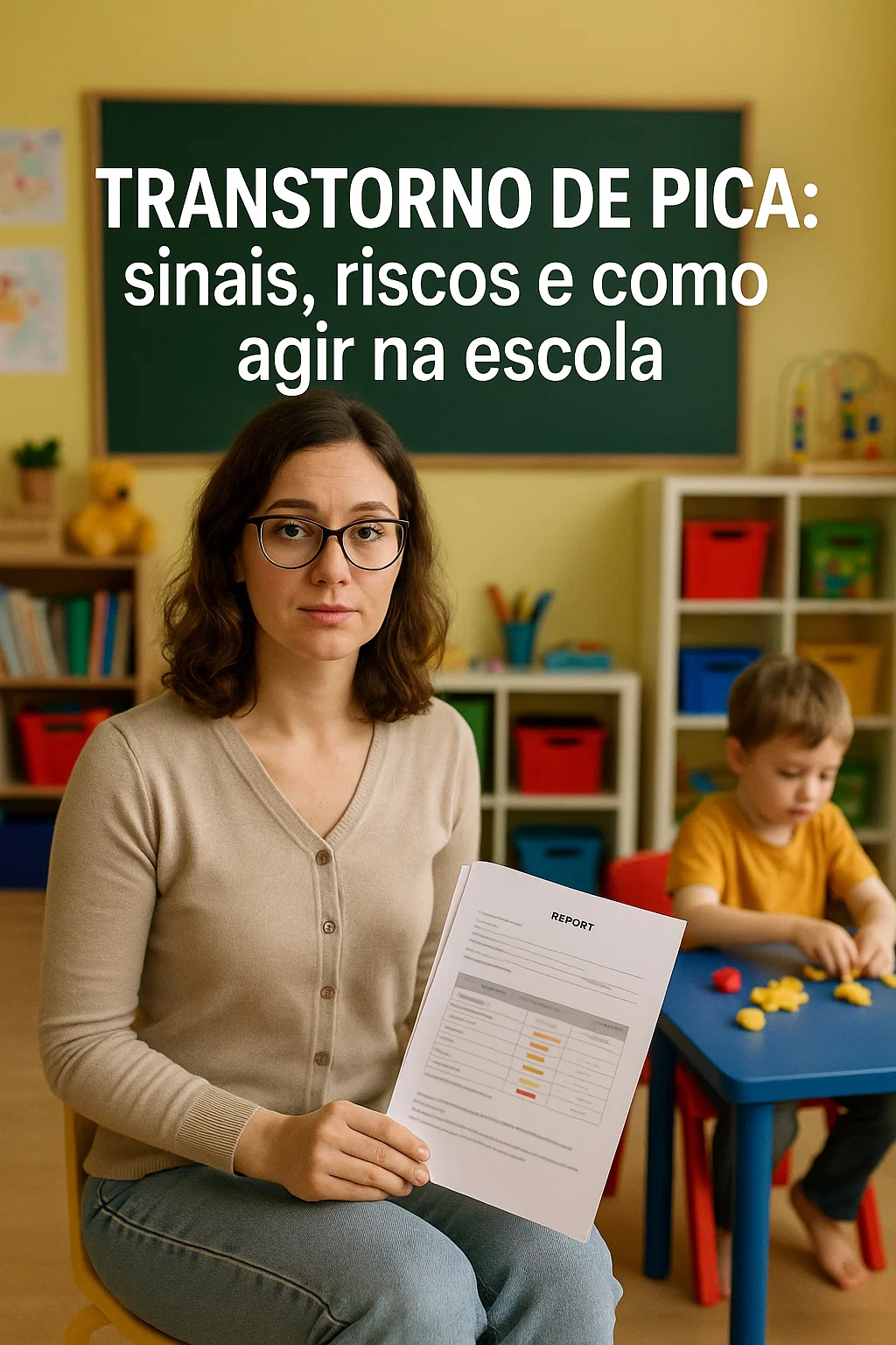 Palavras-chave: transtorno de pica, ingestão de objetos não comestíveis, pica em crianças, sintomas pica, causas pica, diagnóstico pica, tratamento pica, estratégias pedagógicas, desenvolvimento infantil, relatório escolar, práticas pedagógicas, BNCC, psicologia infantil, educação infantil, saúde mental infantil, acompanhamento pedagógico, transtornos alimentares na infância, psicopedagogia, professores educação infantil, TEA, Síndrome de Down