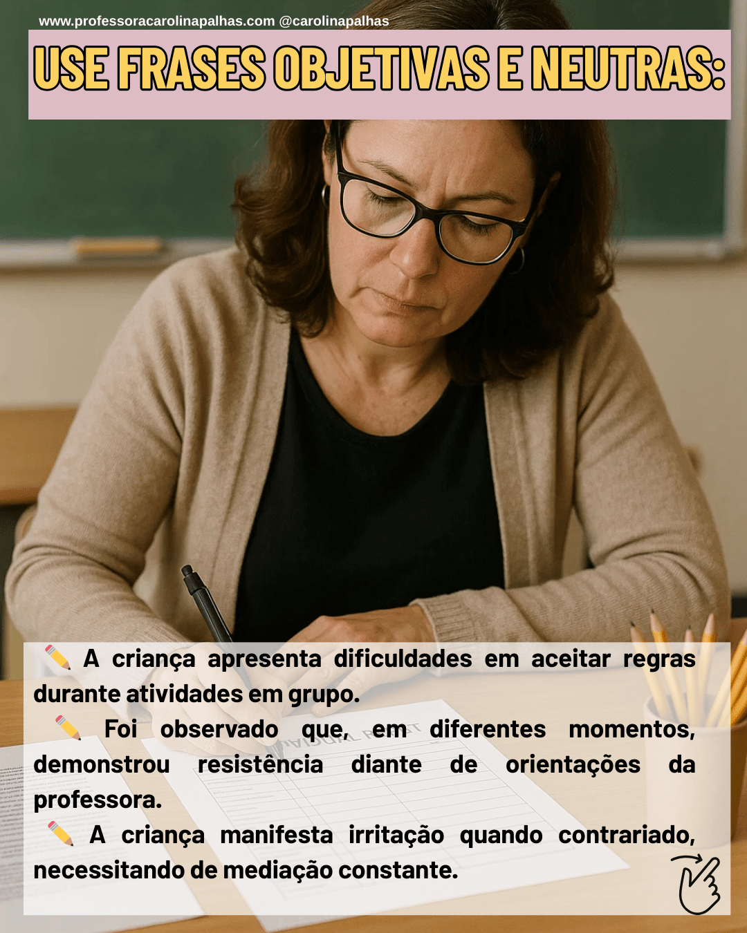✏️ “Foi observado que, em diferentes momentos, demonstrou resistência diante de orientações da professora.”
