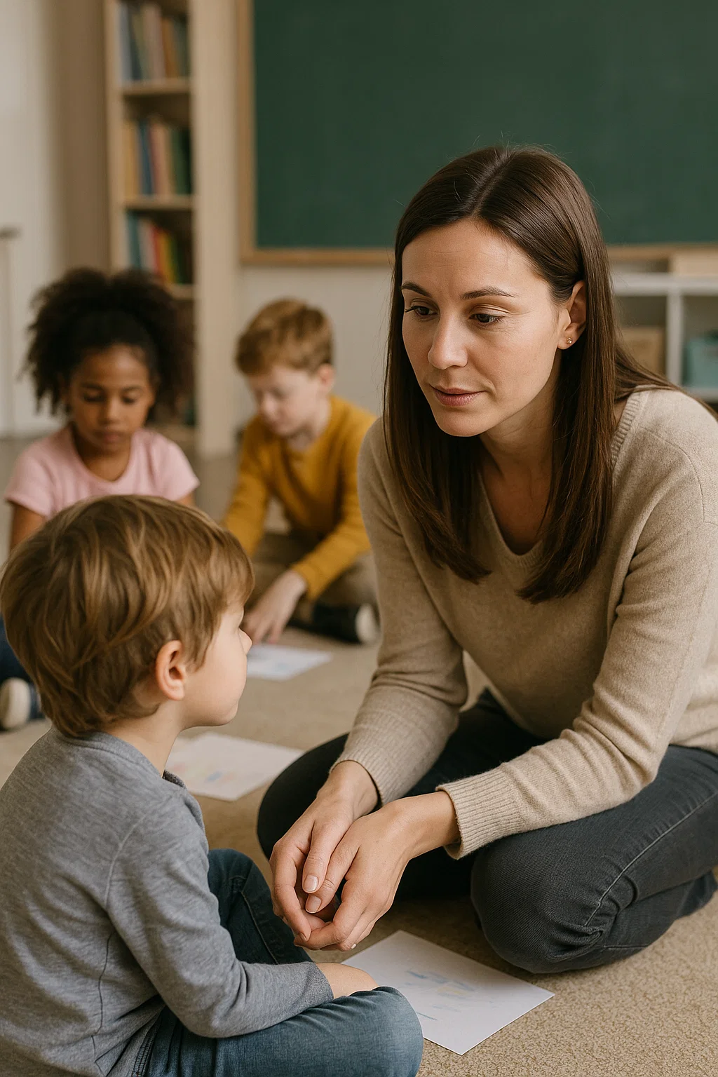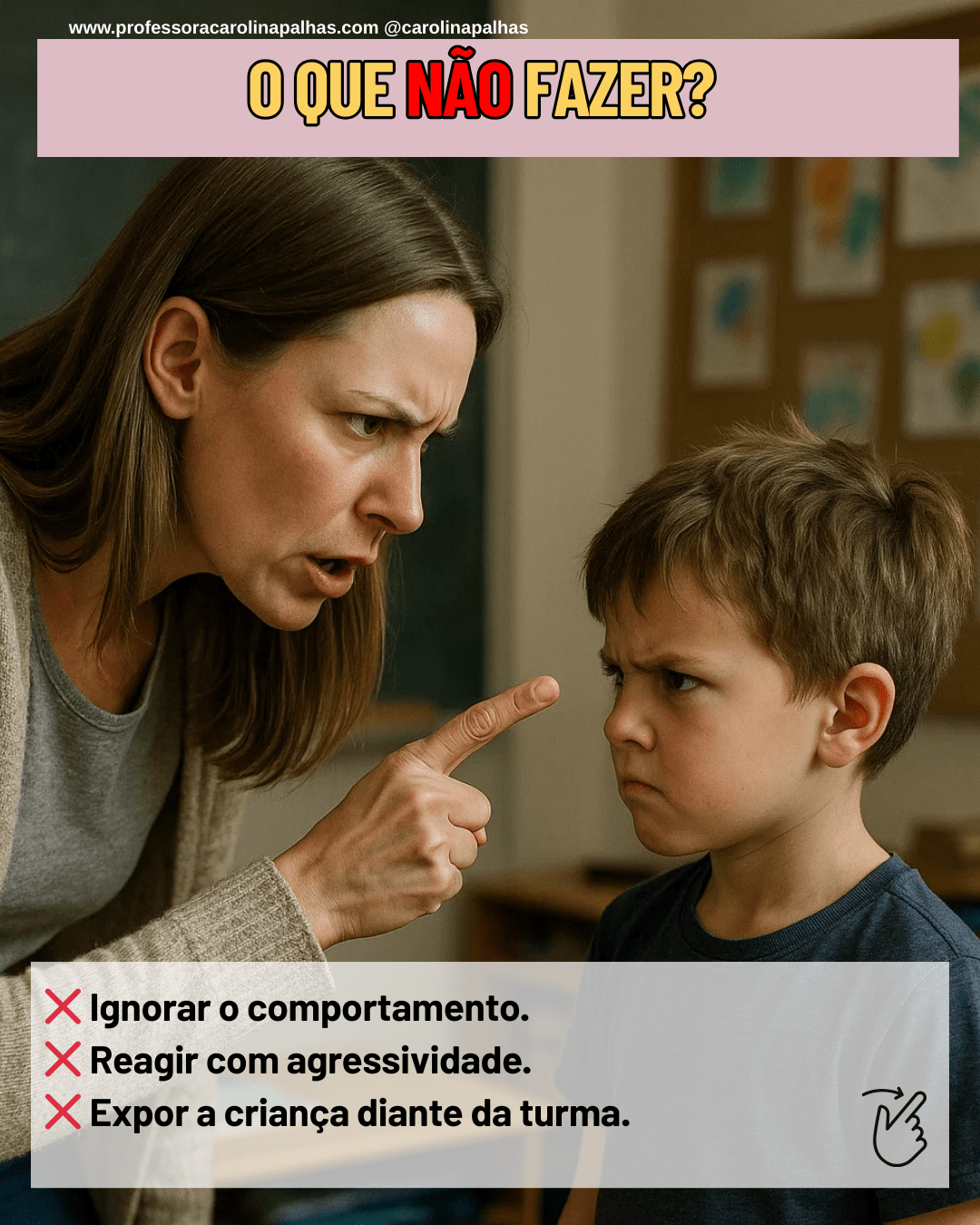 ❌ Expor a criança diante da turma (aumenta a resistência e prejudica a autoestima).