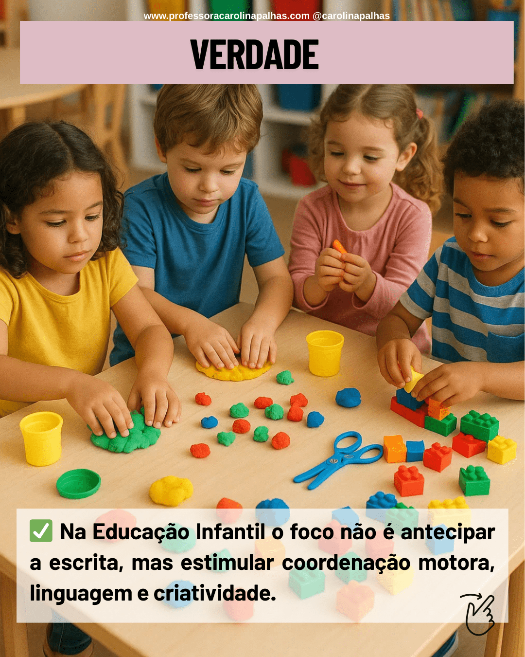 ✅ O que prepara a criança para a escrita são atividades lúdicas e intencionais, como brincar com massinha, rasgar papéis, pintar, colar, recortar e até empilhar blocos. Essas vivências fortalecem músculos da mão e estimulam a criatividade, além de desenvolver a linguagem oral.