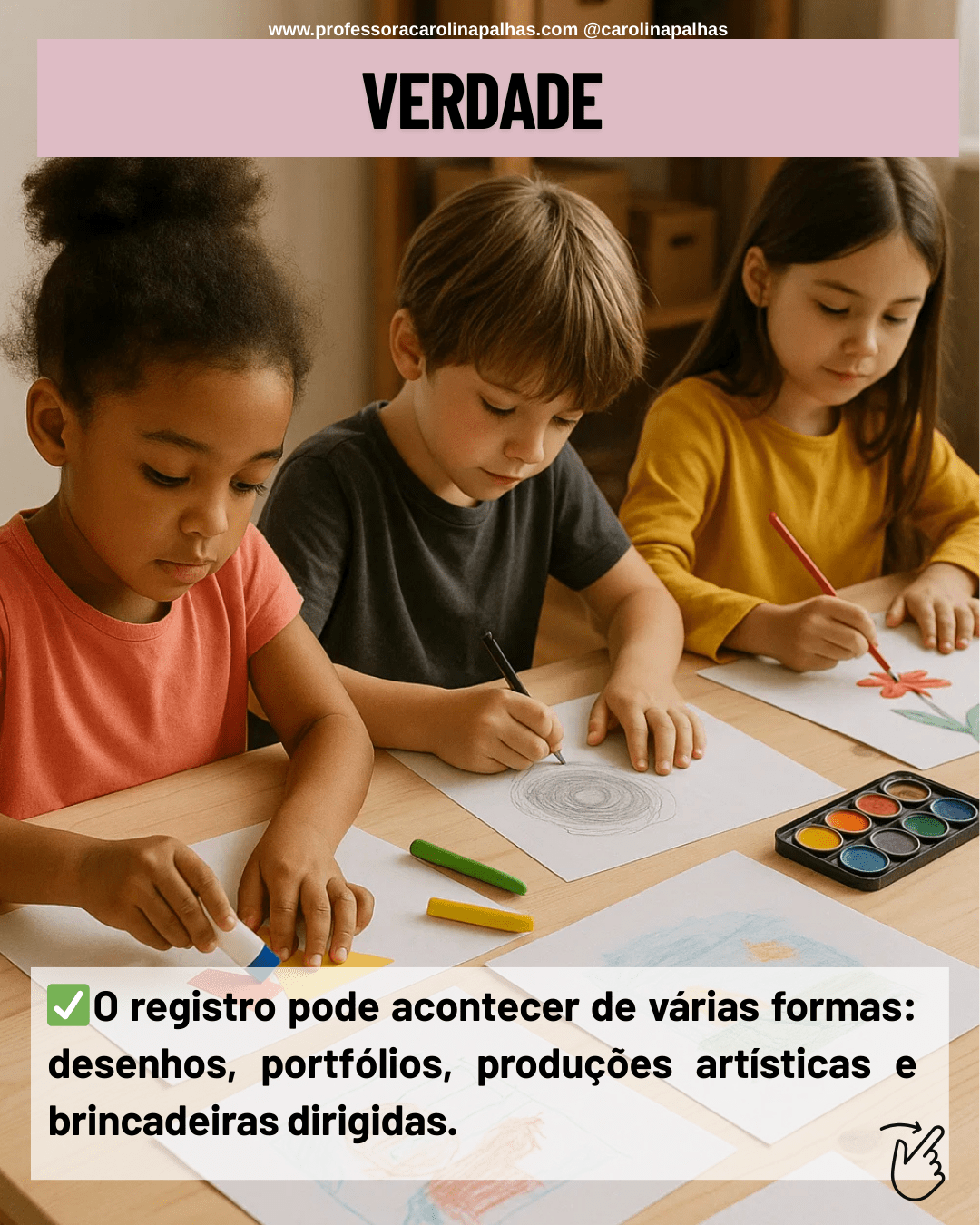 ✅ O registro pedagógico pode acontecer de diversas formas: portfólios, murais, fotografias, vídeos, produções artísticas, brincadeiras dirigidas, relatórios descritivos e até diários de bordo da turma. Tudo isso também comunica e documenta o desenvolvimento infantil.