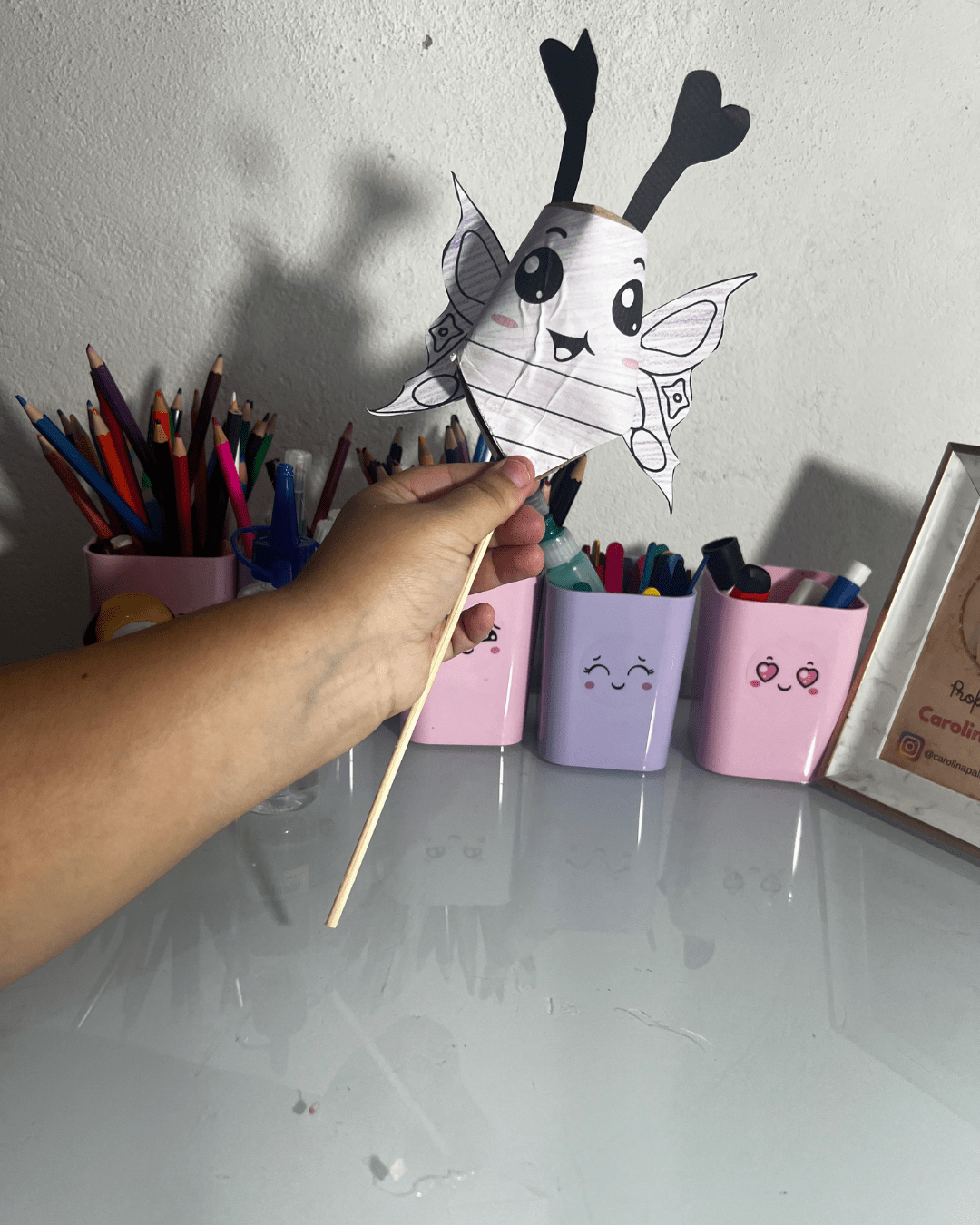 - Materiais: Palitos de churrasco sem ponta, cola, canetinhas, lápis de cor.