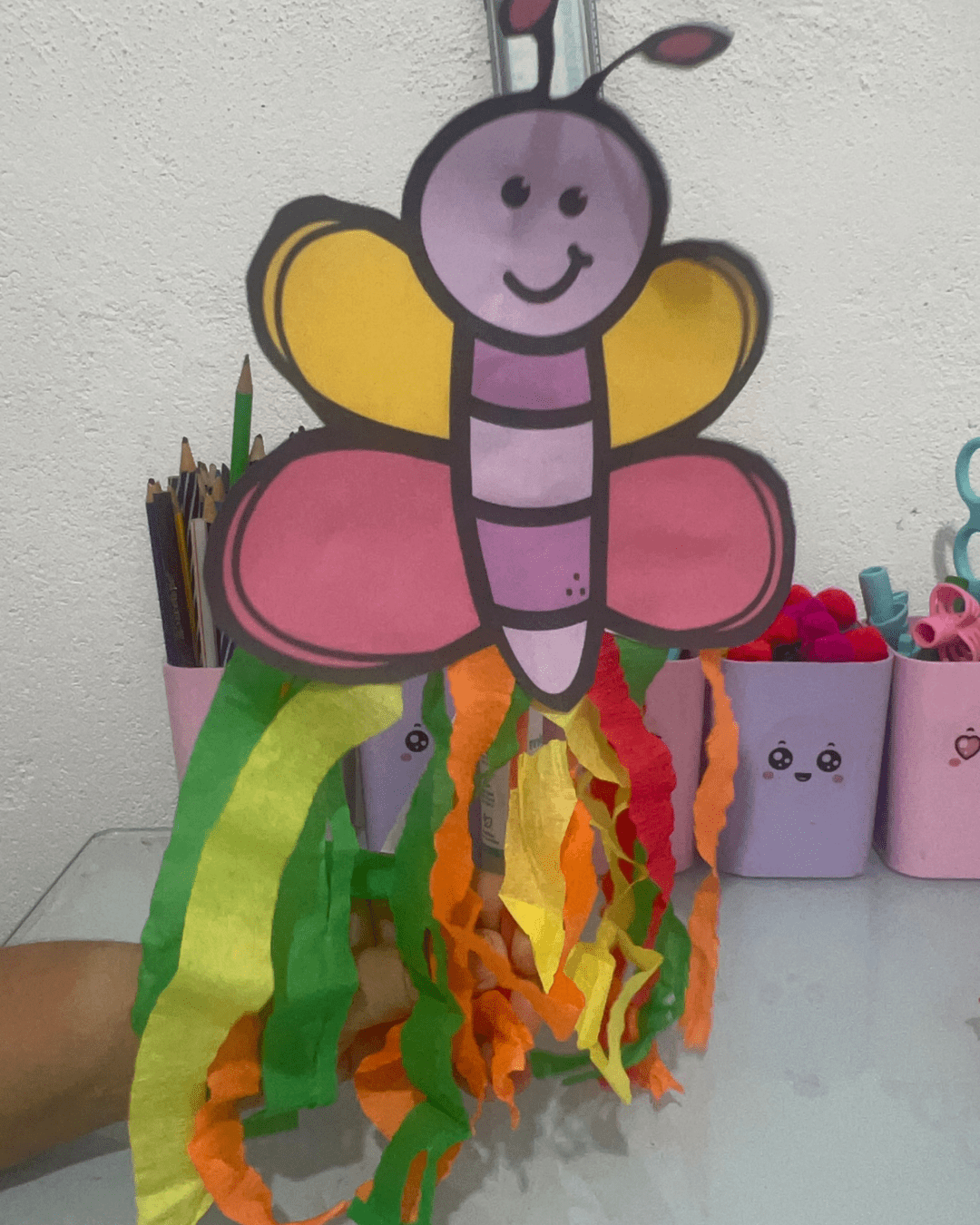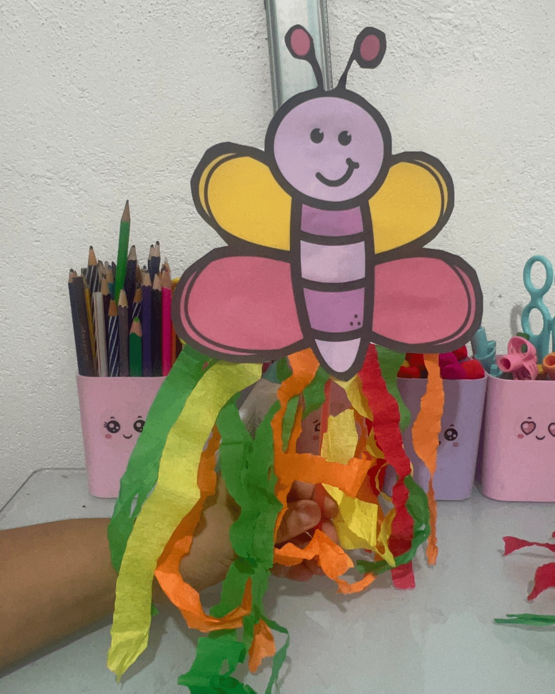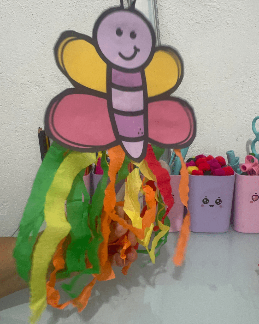 Borboleta com fitas coloridas (atividade anexa): recortar a borboleta, colar fitas como asas móveis.