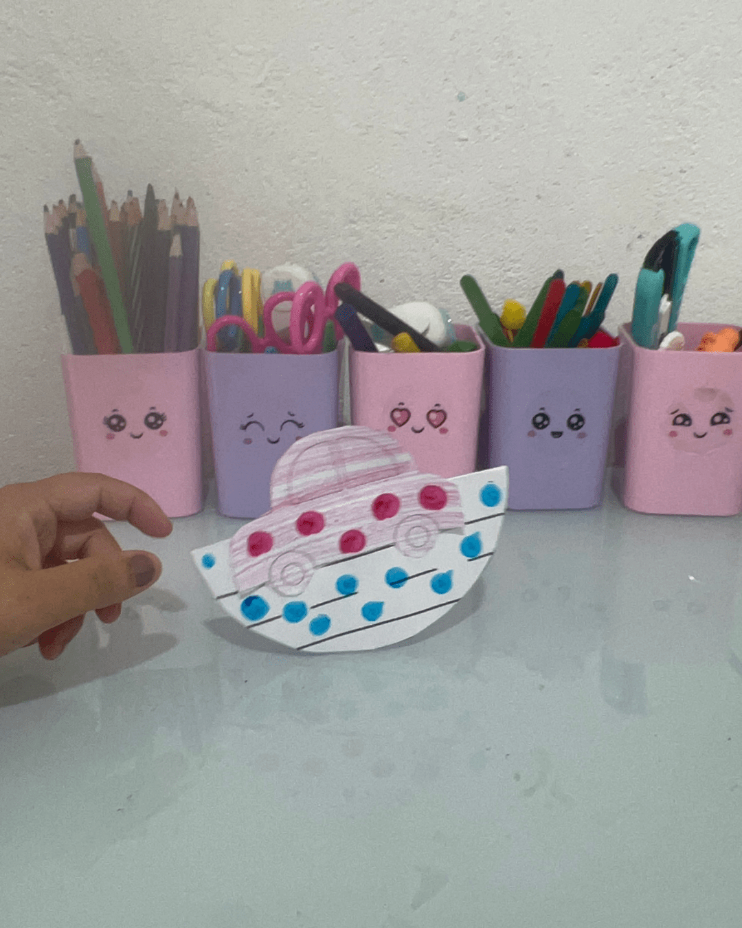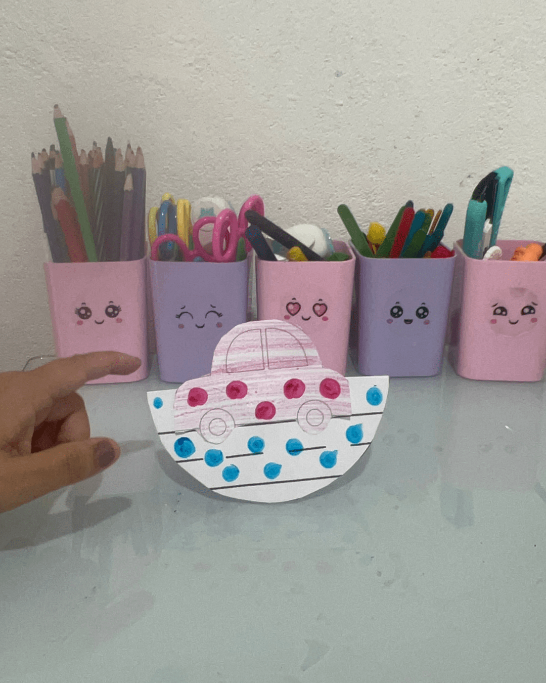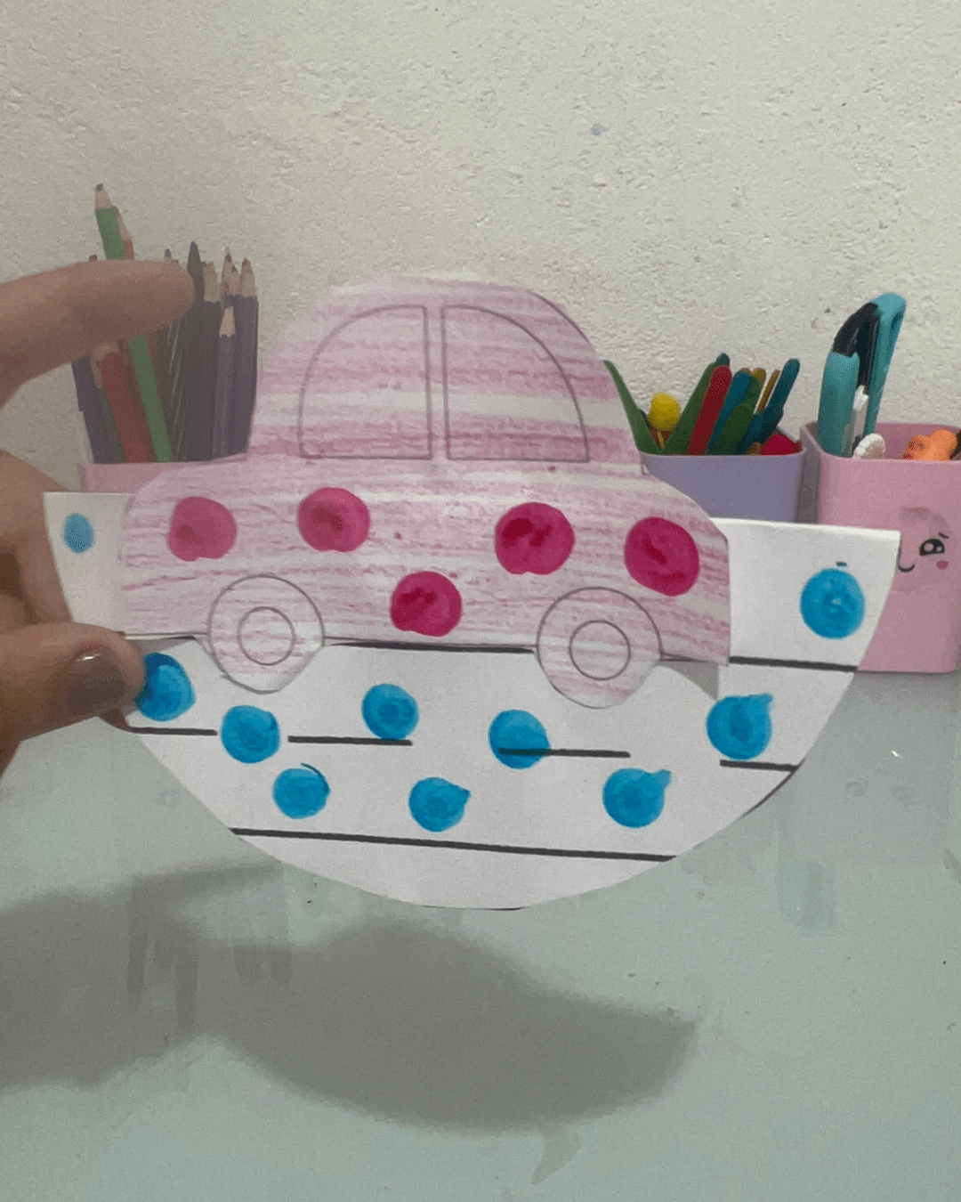 Exposição das produções da semana: carrinhos, desenhos e cartazes.
