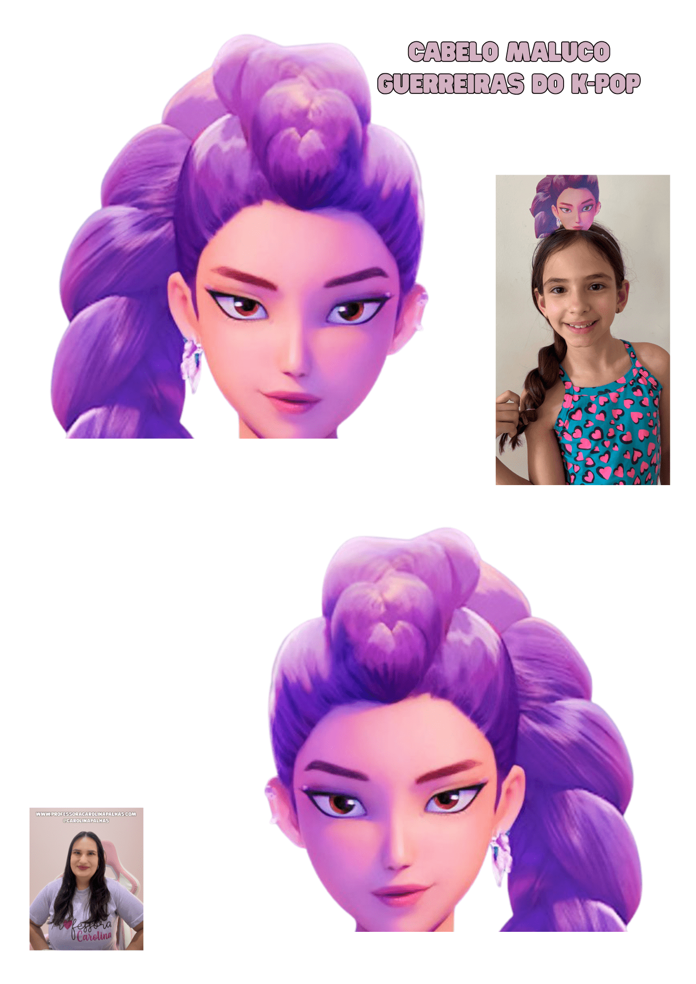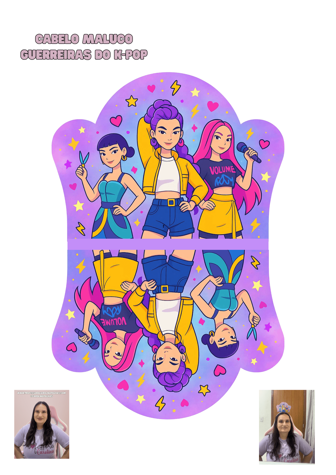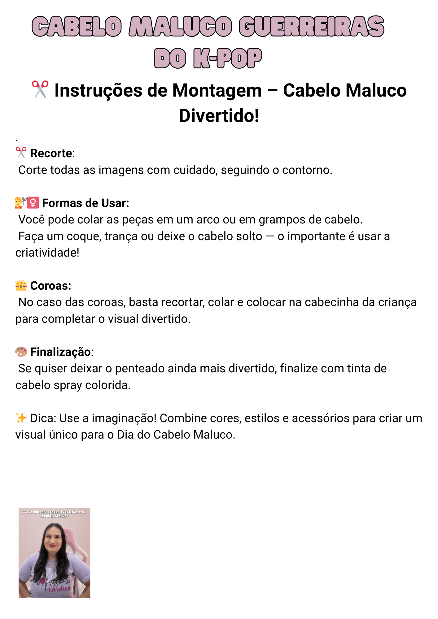 ✨ Dica: essa atividade também pode ser feita em sala como uma oficina de arte, permitindo que cada criança personalize seu próprio cabelo maluco e crie o nome de sua “Guerreira do K-pop”.