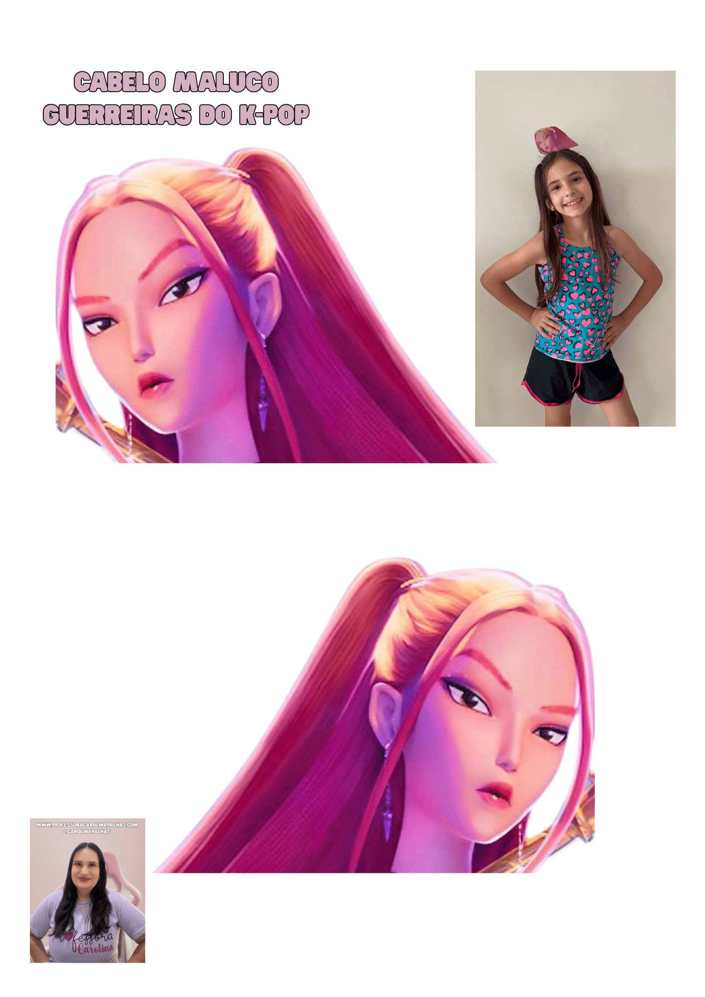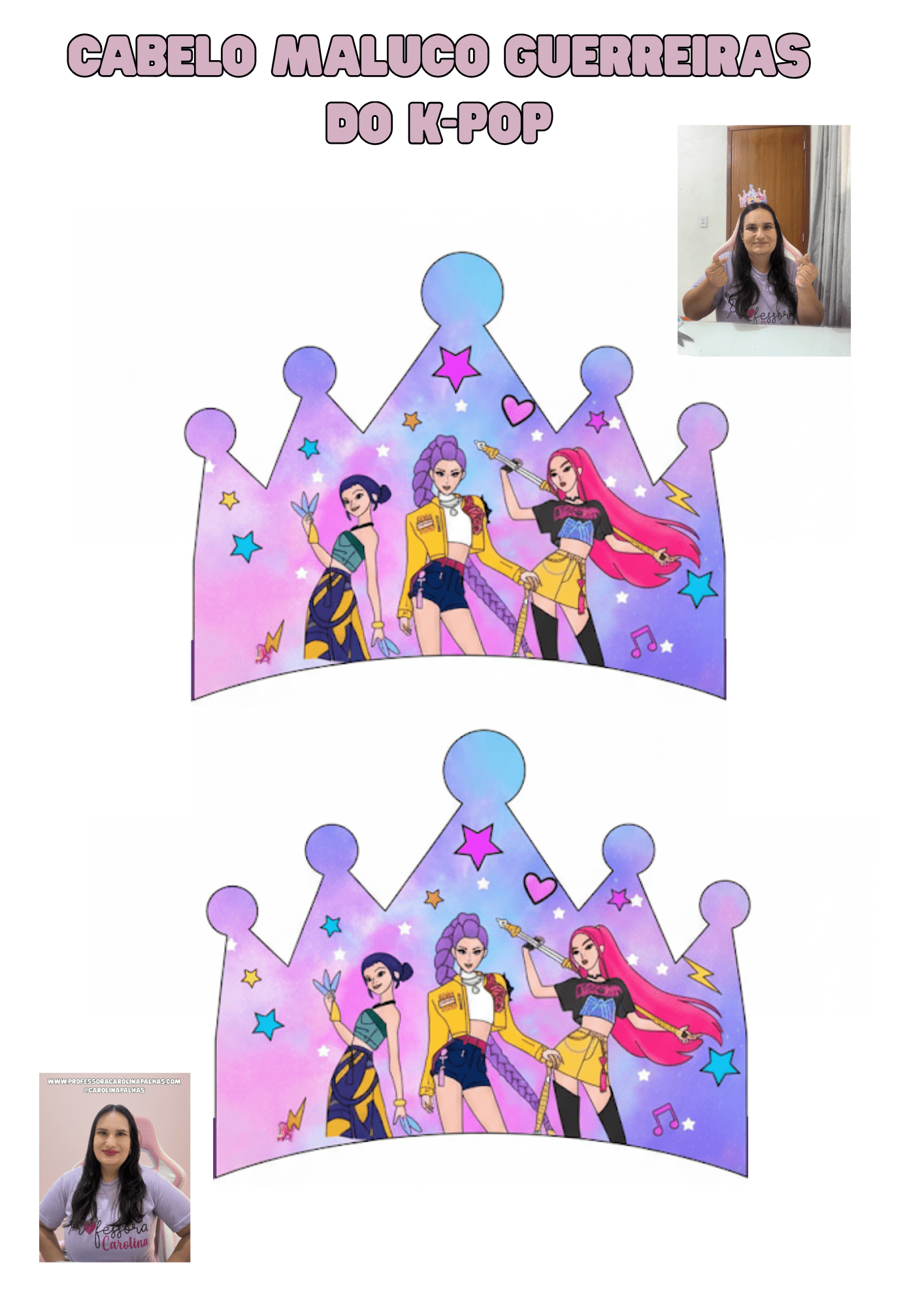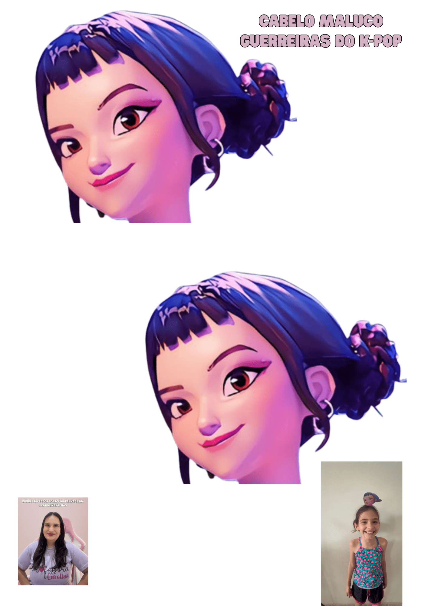 ✨ Dica: essa atividade também pode ser feita em sala como uma oficina de arte, permitindo que cada criança personalize seu próprio cabelo maluco e crie o nome de sua “Guerreira do K-pop”.