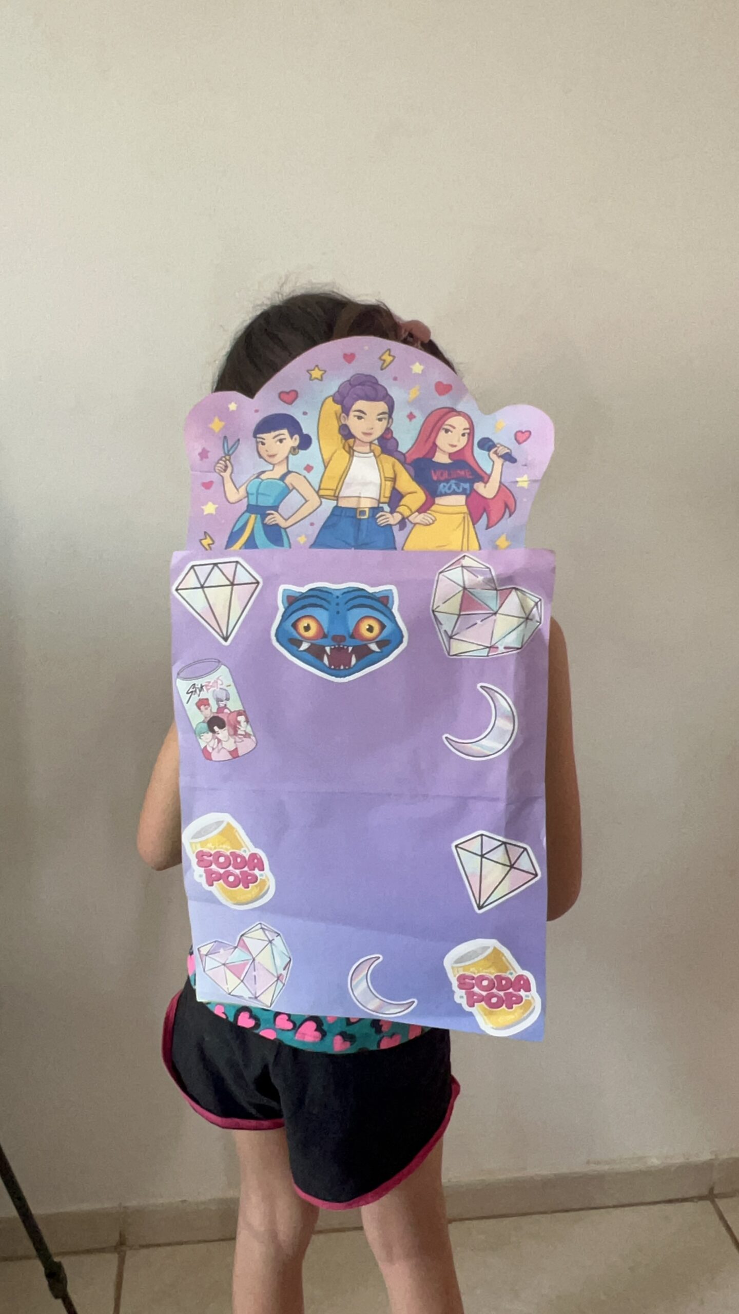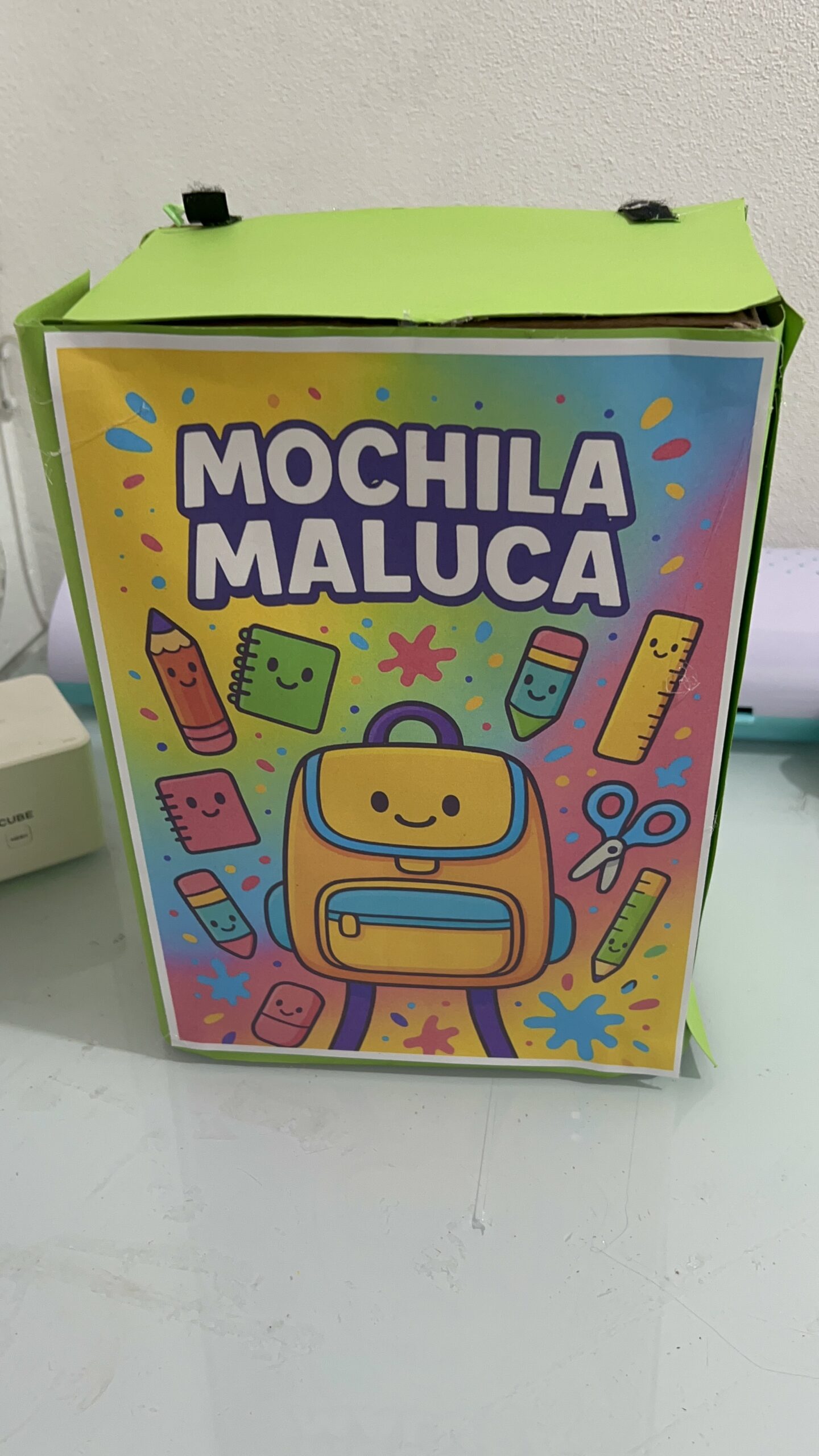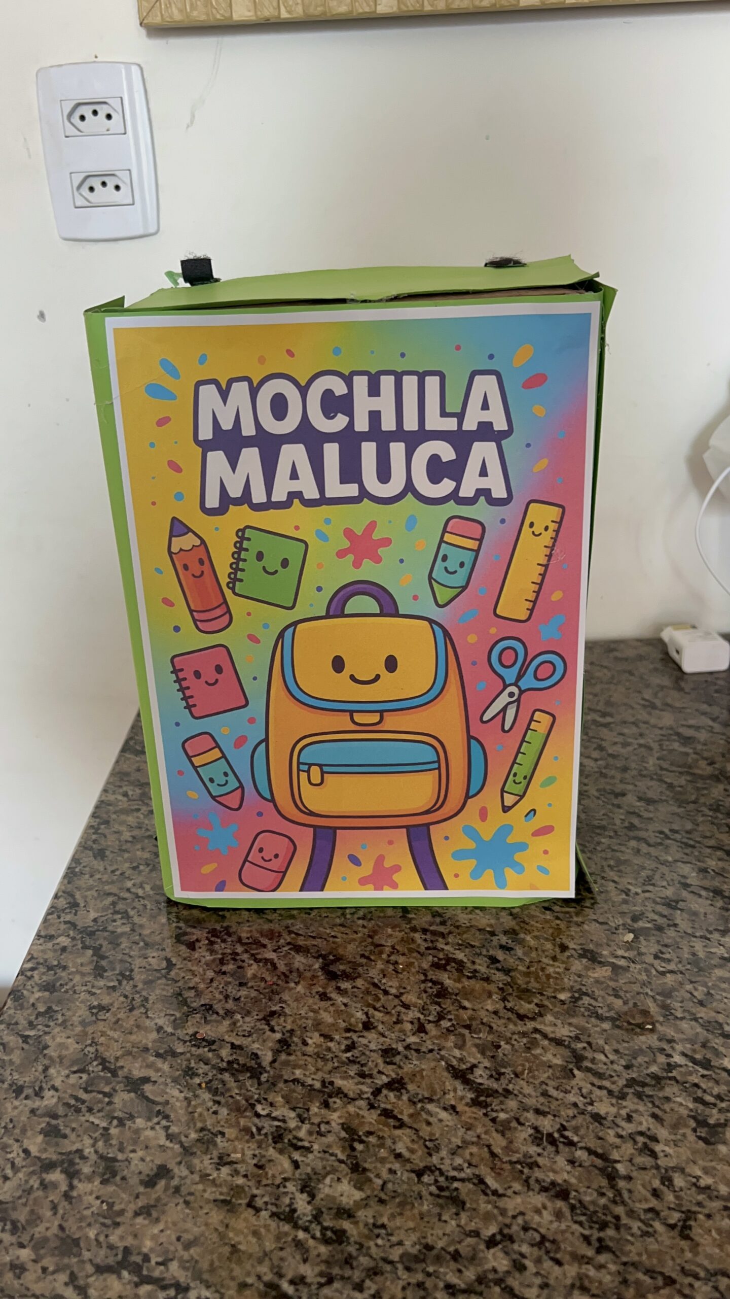 Cole a imagem da Mochila Maluca na frente da caixa com cola bastão ou fita dupla face.