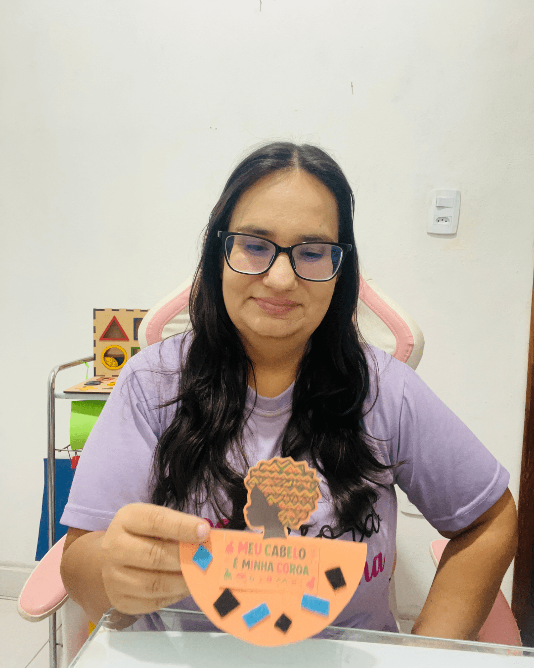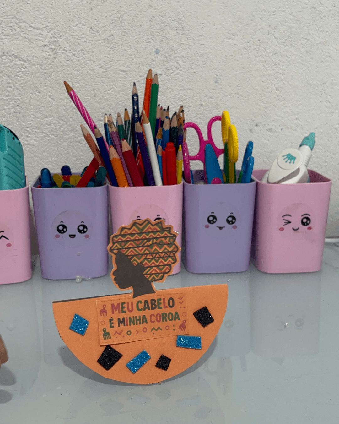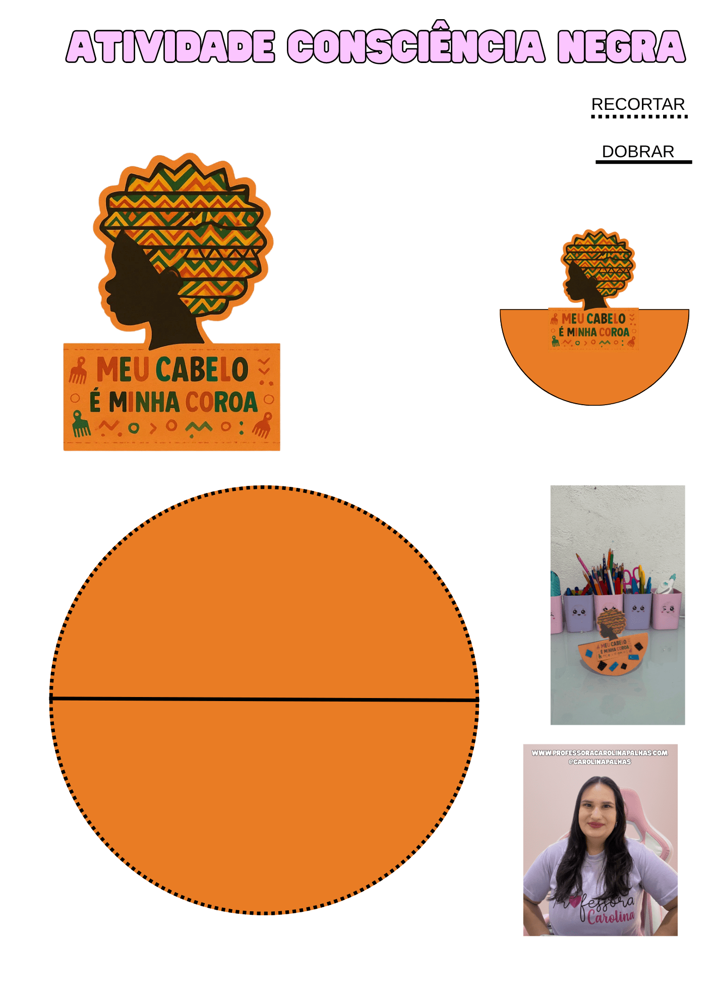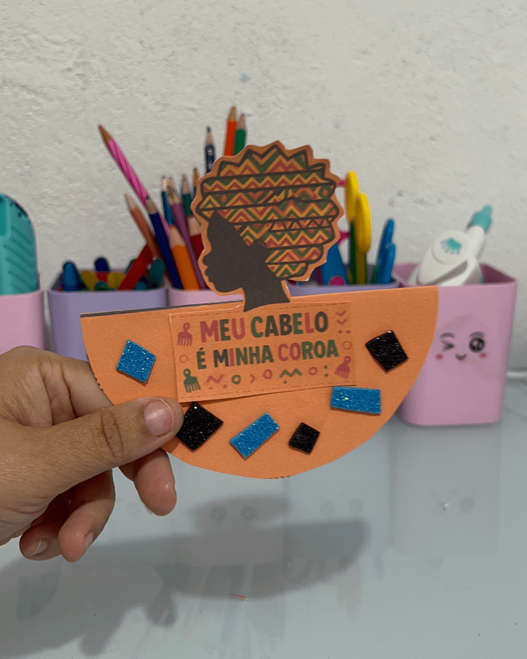 Todas as versões podem incluir o bumerang da Consciência Negra, com a professora auxiliando na colagem das peças e conduzindo conversas sobre o significado da frase “Meu cabelo é minha coroa”.