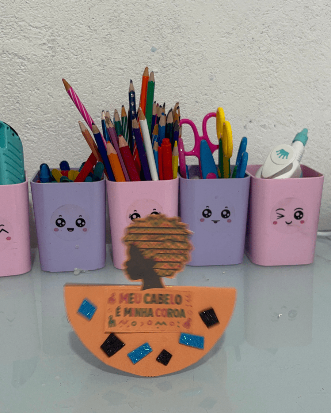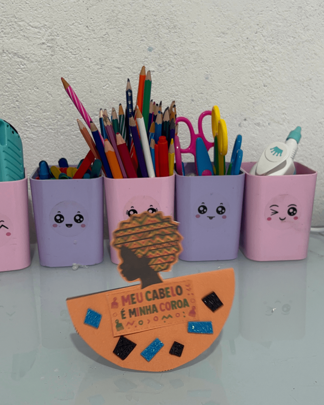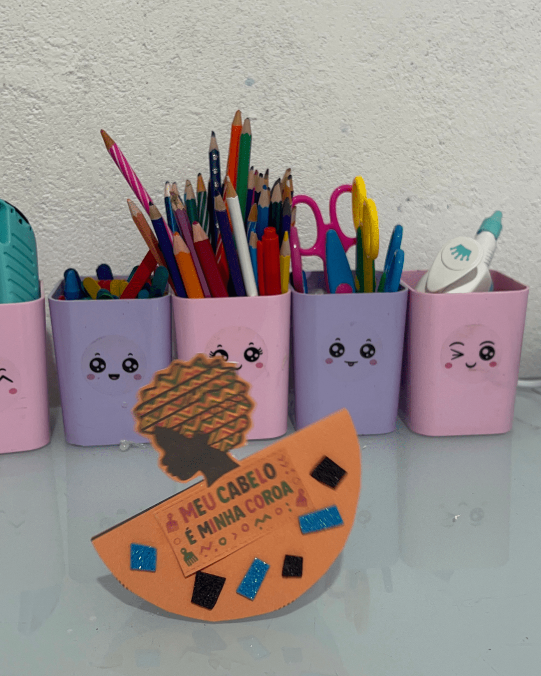 Moldes impressos (com o cabelo afro e a frase “Meu cabelo é minha coroa”).