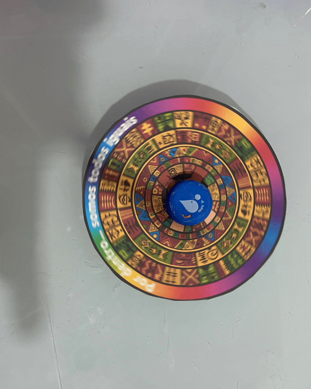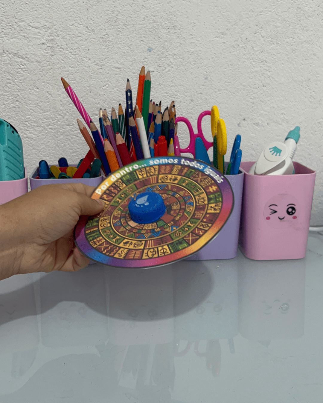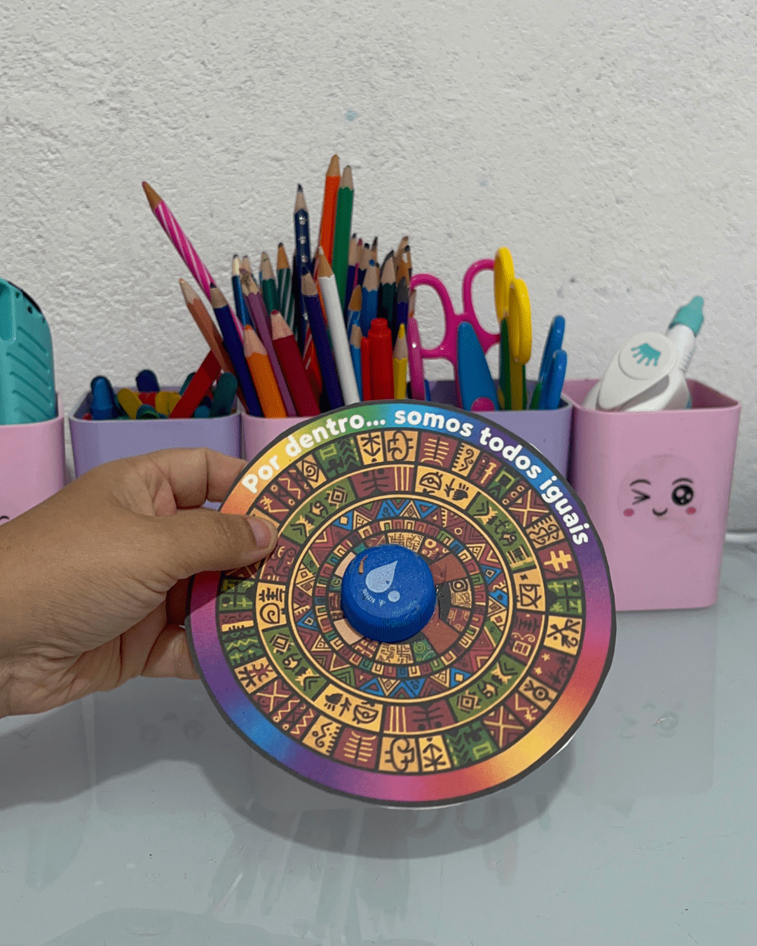 Cada giro do pião representa o movimento da vida — que muda, mistura e se renova com as cores de cada um de nós. 🌈