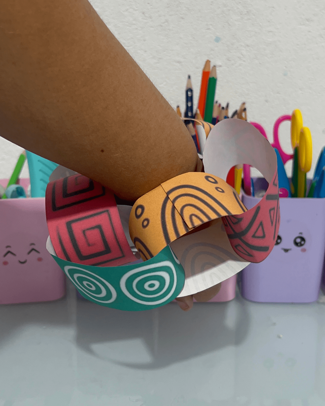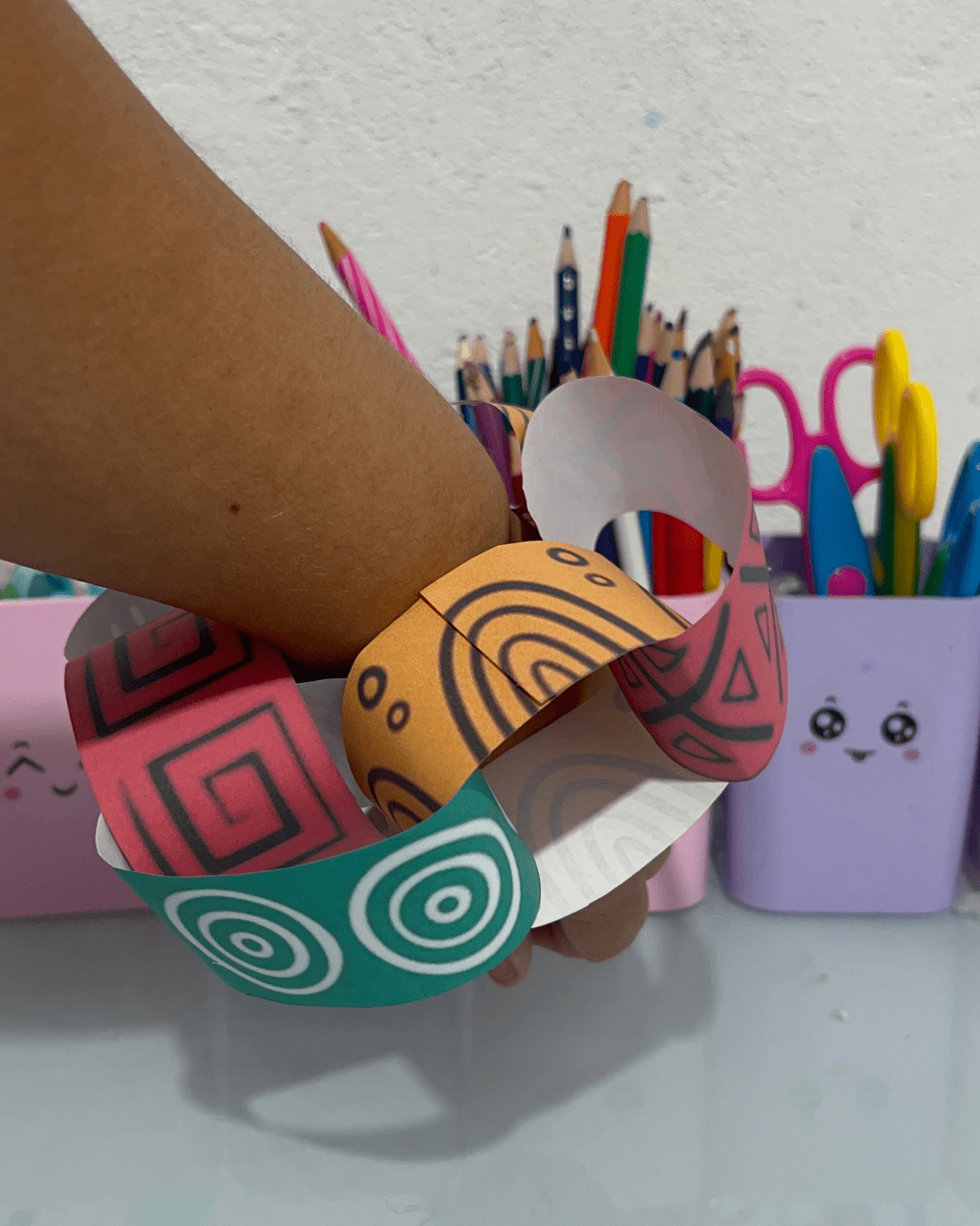 Após a decoração, as crianças podem colar ou grampear as pontas das tiras, formando um círculo que encaixe no braço. -