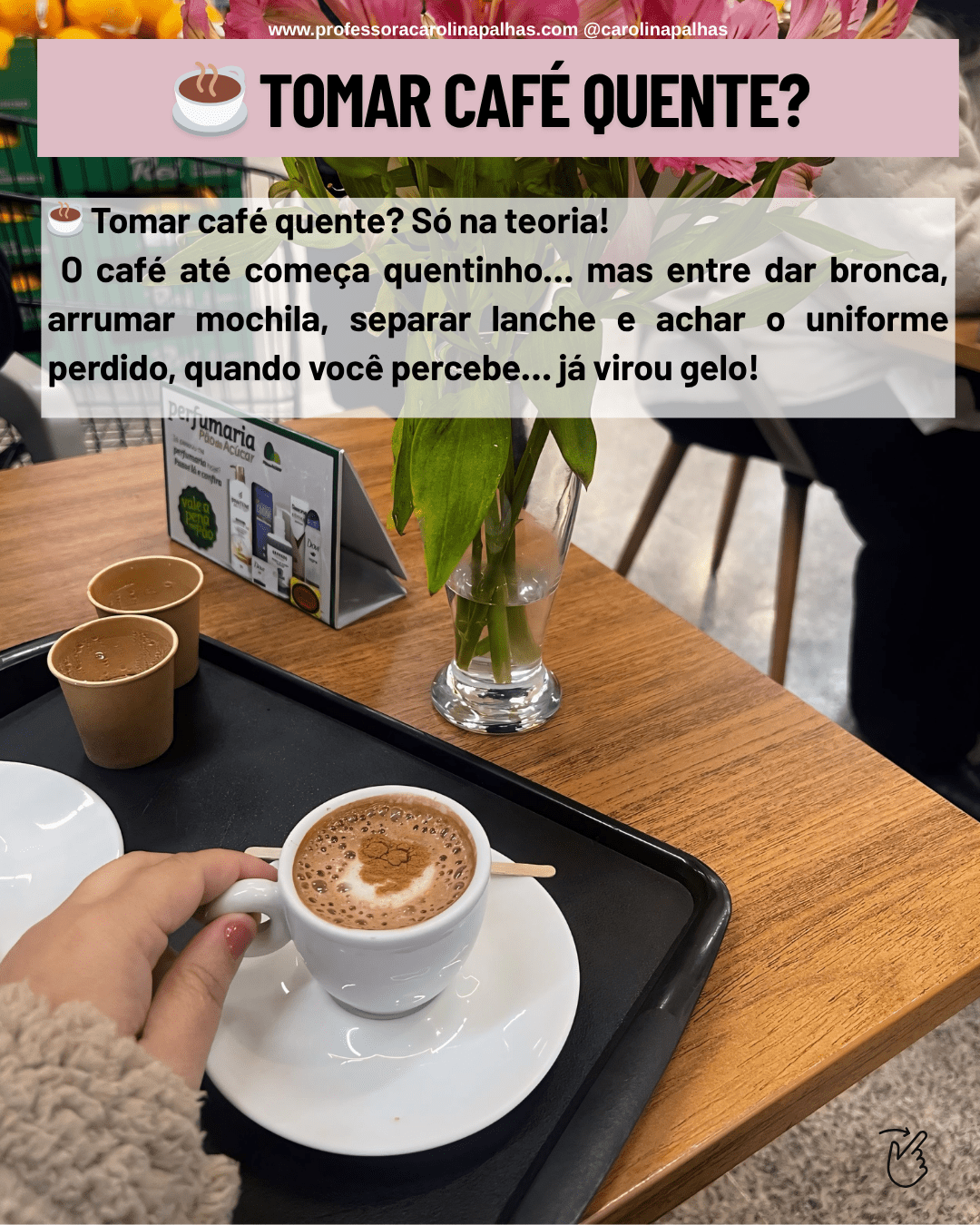👉 Dica de autocuidado: tente reservar cinco minutinhos para você — nem que seja pra tomar esse café em silêncio. Pequenas pausas salvam o humor (e a sanidade).