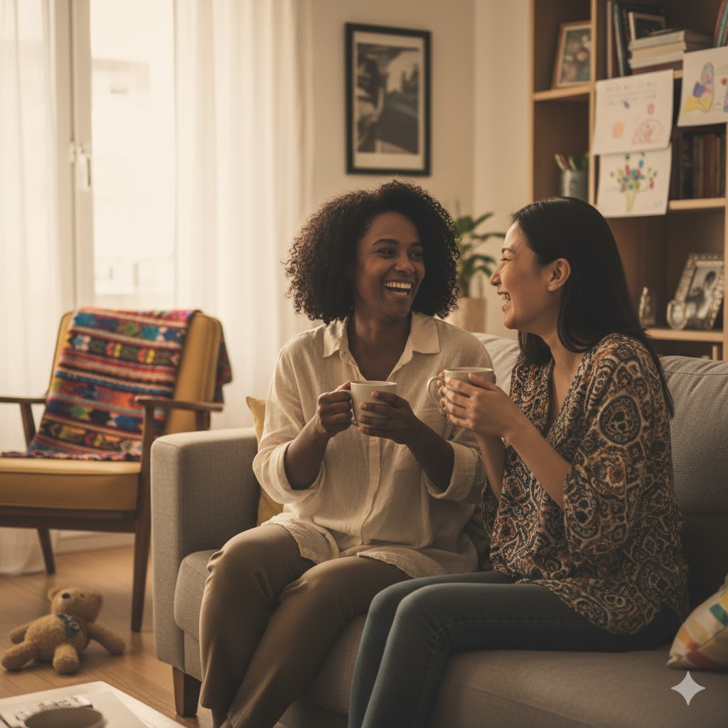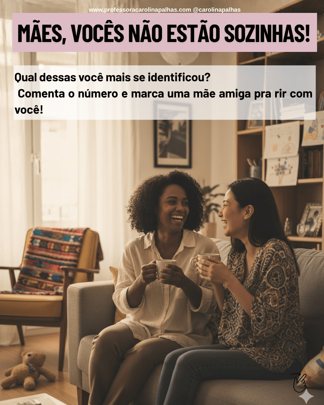 Marque uma mãe amiga pra rir com você — porque rir é a melhor forma de sobreviver ao caos com leveza.