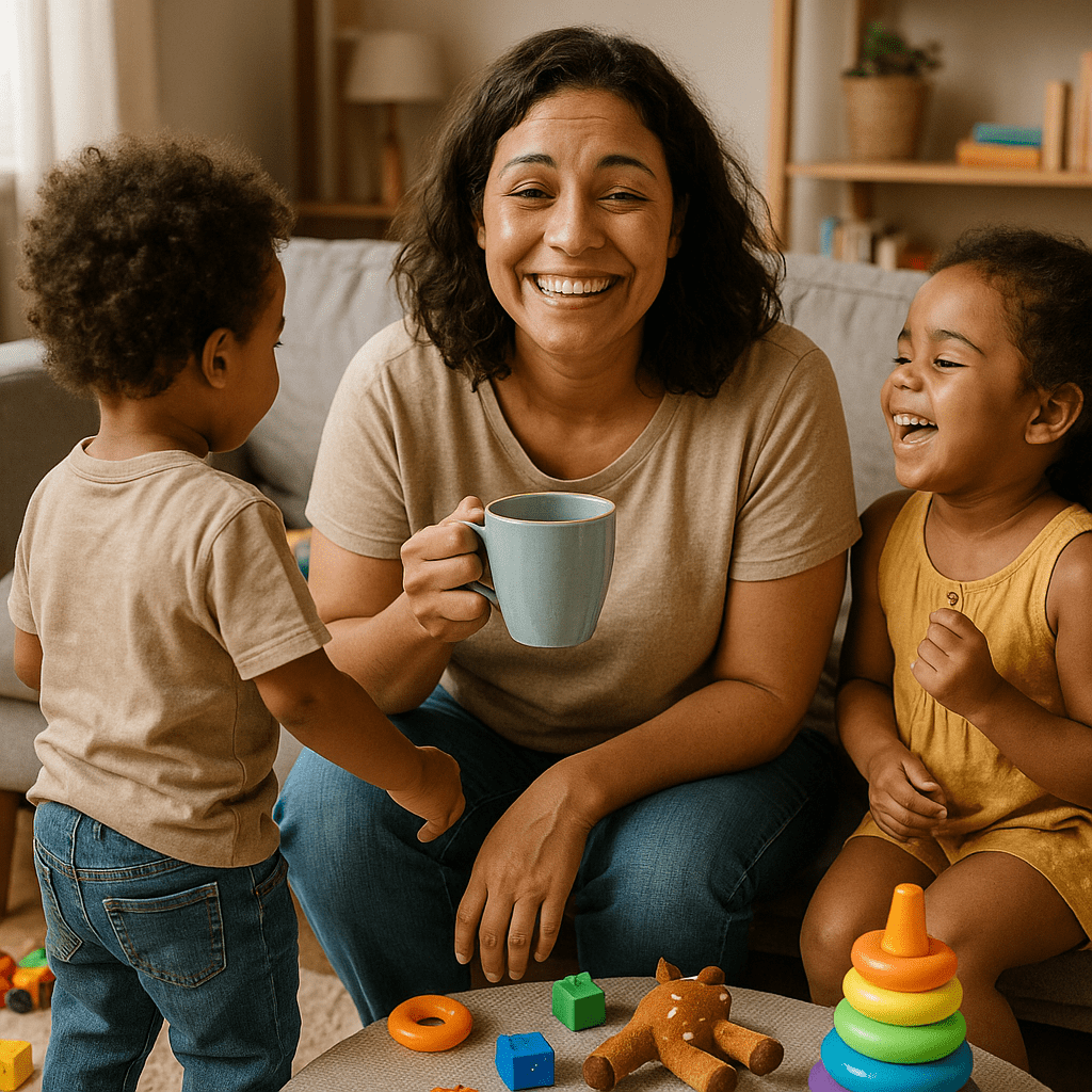 “Mãe brasileira sorrindo cansada com uma caneca de café, brinquedos espalhados ao redor, ambiente de casa acolhedora com luz natural suave, estilo fotografia lifestyle, tons quentes, realista e acolhedor.”