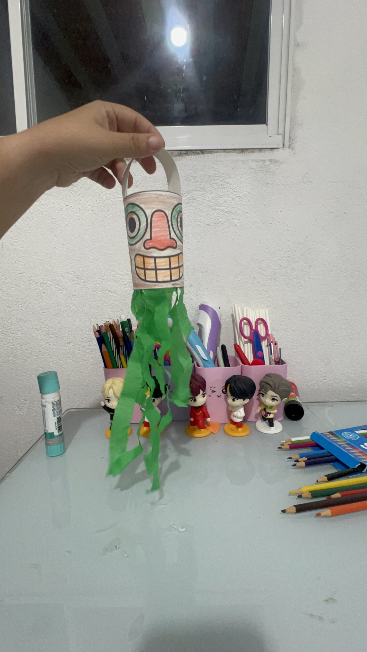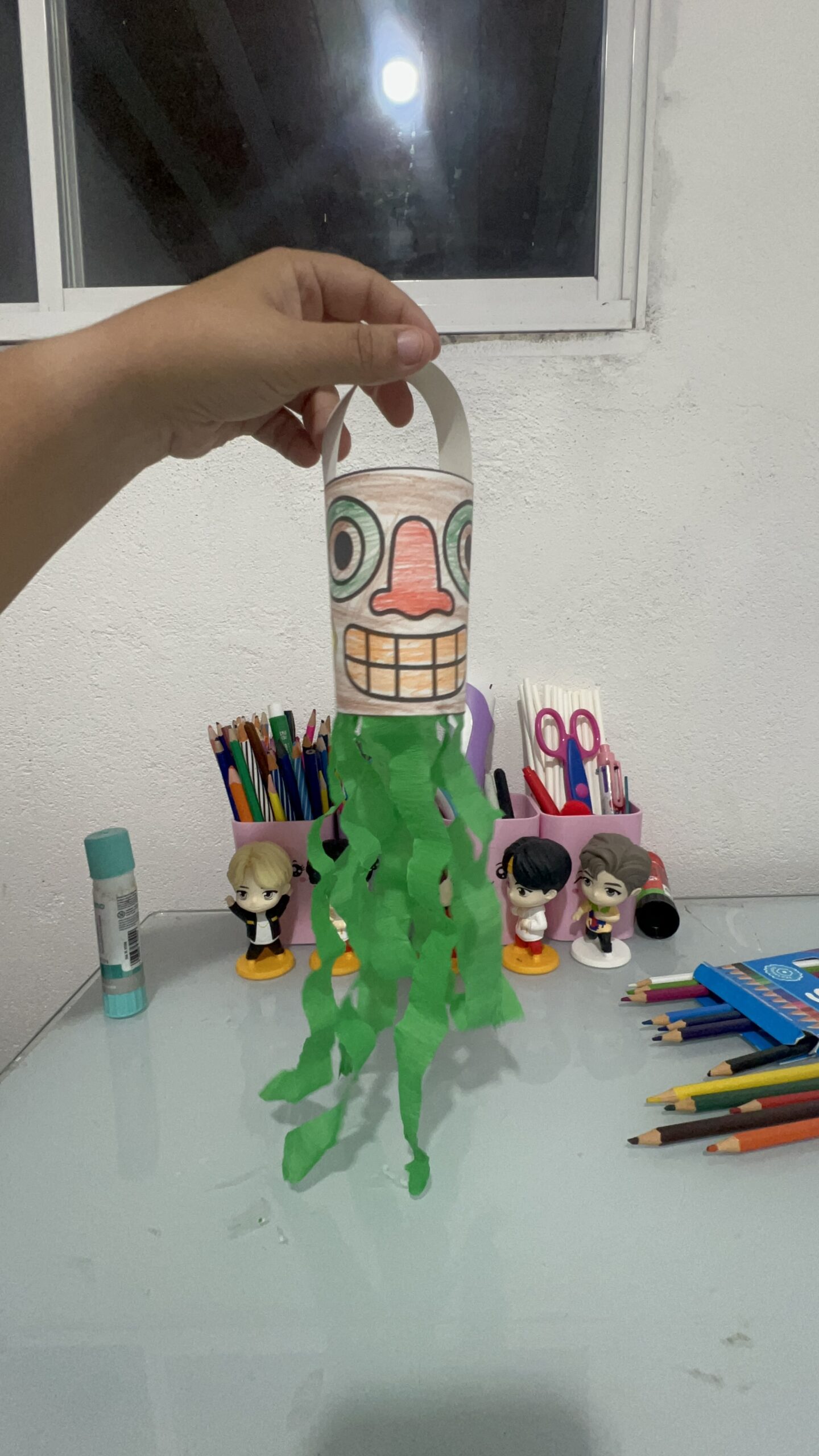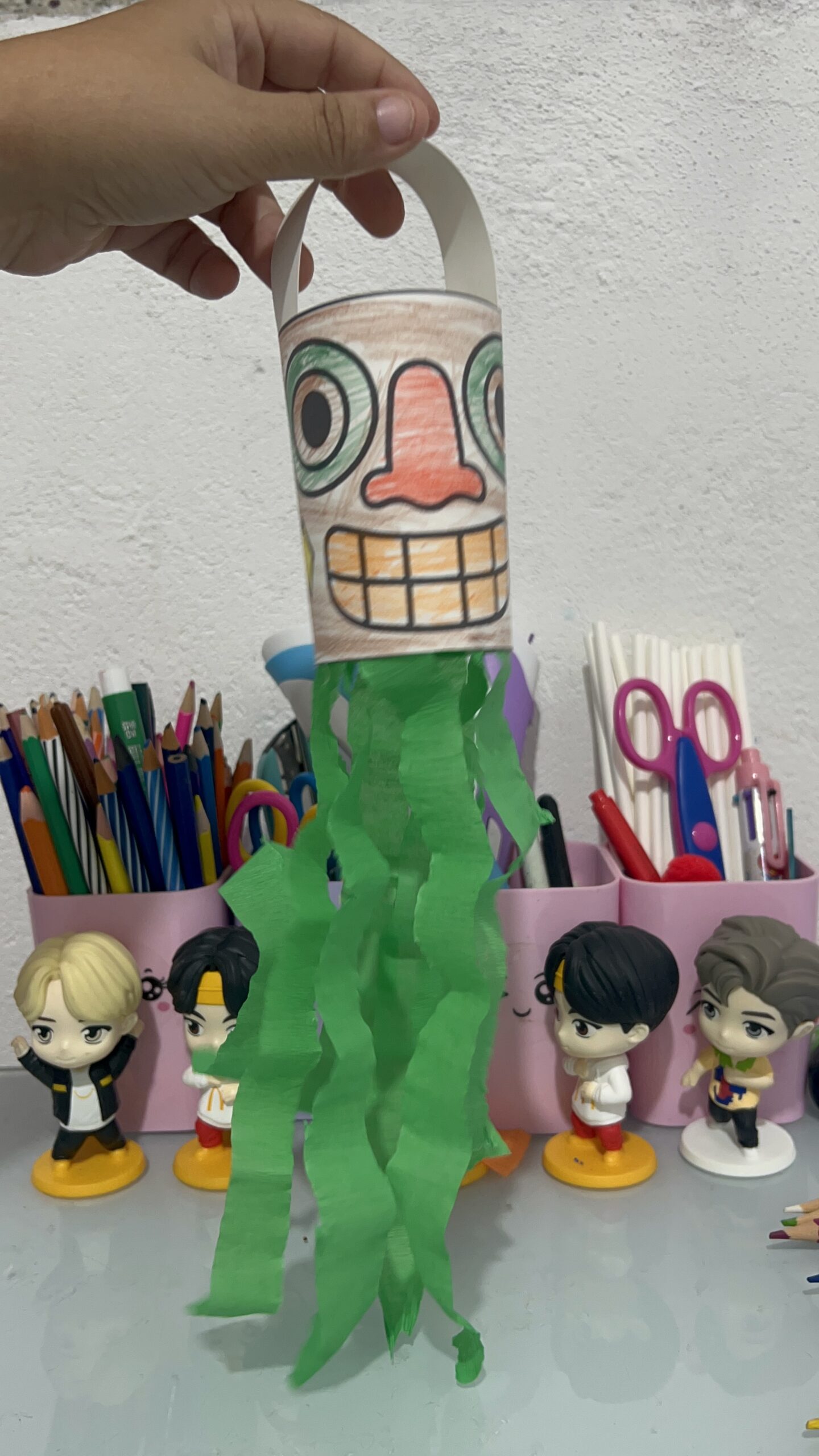 • Descrição: Colar as fitas de papel crepom coloridas na parte inferior da carranca e fazer a alça na parte superior.