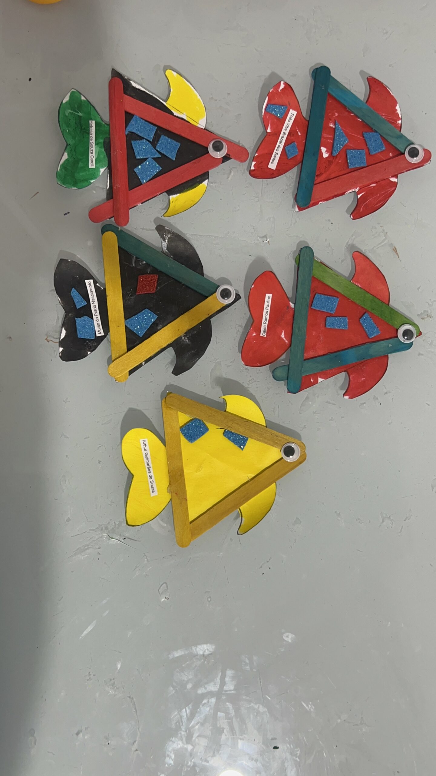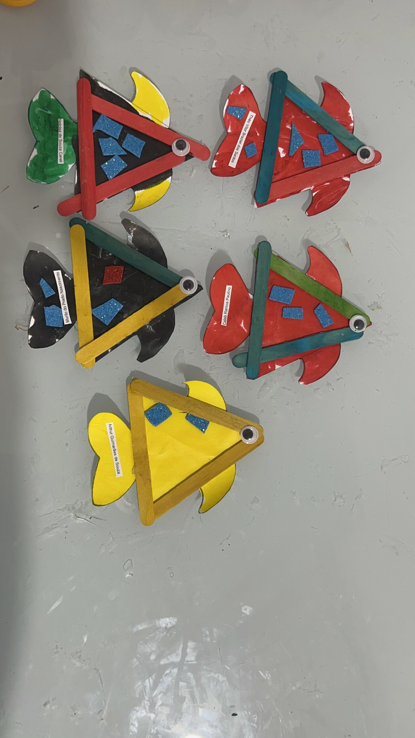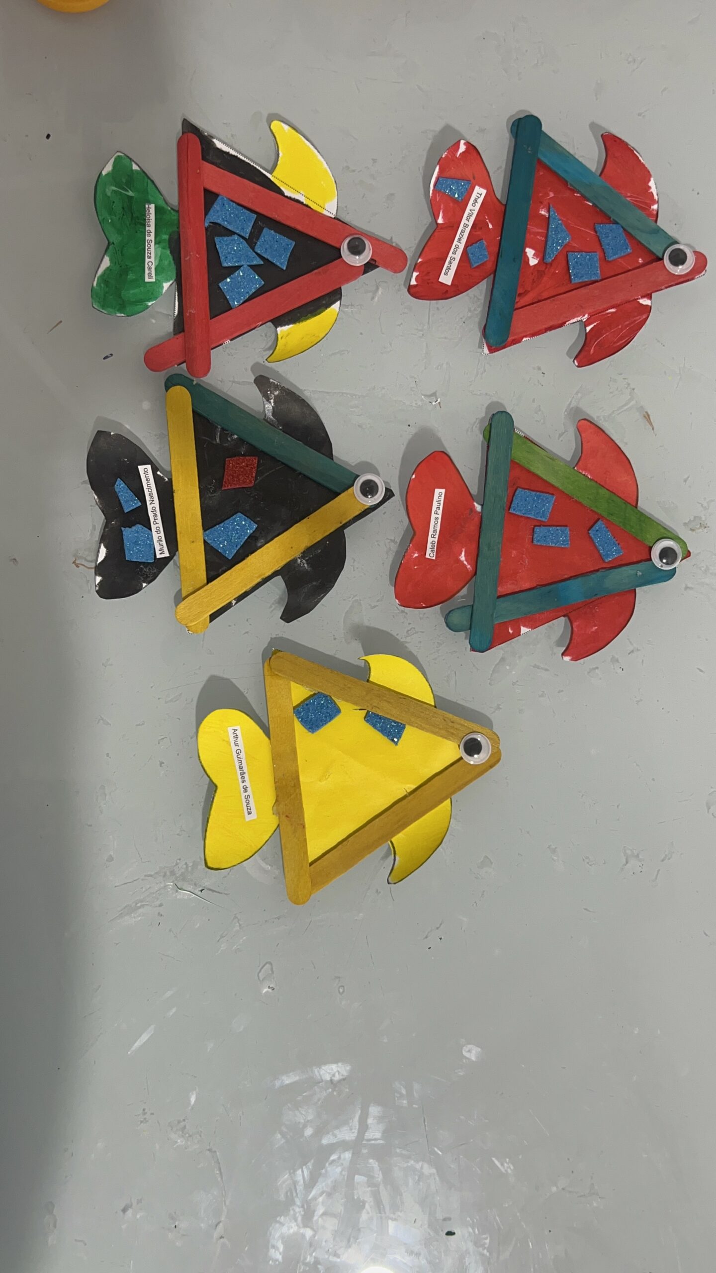 3. Oficina de montagem com palitos de picolé: construção de peixes triangulares com palitos coloridos, olhos móveis e glitter.