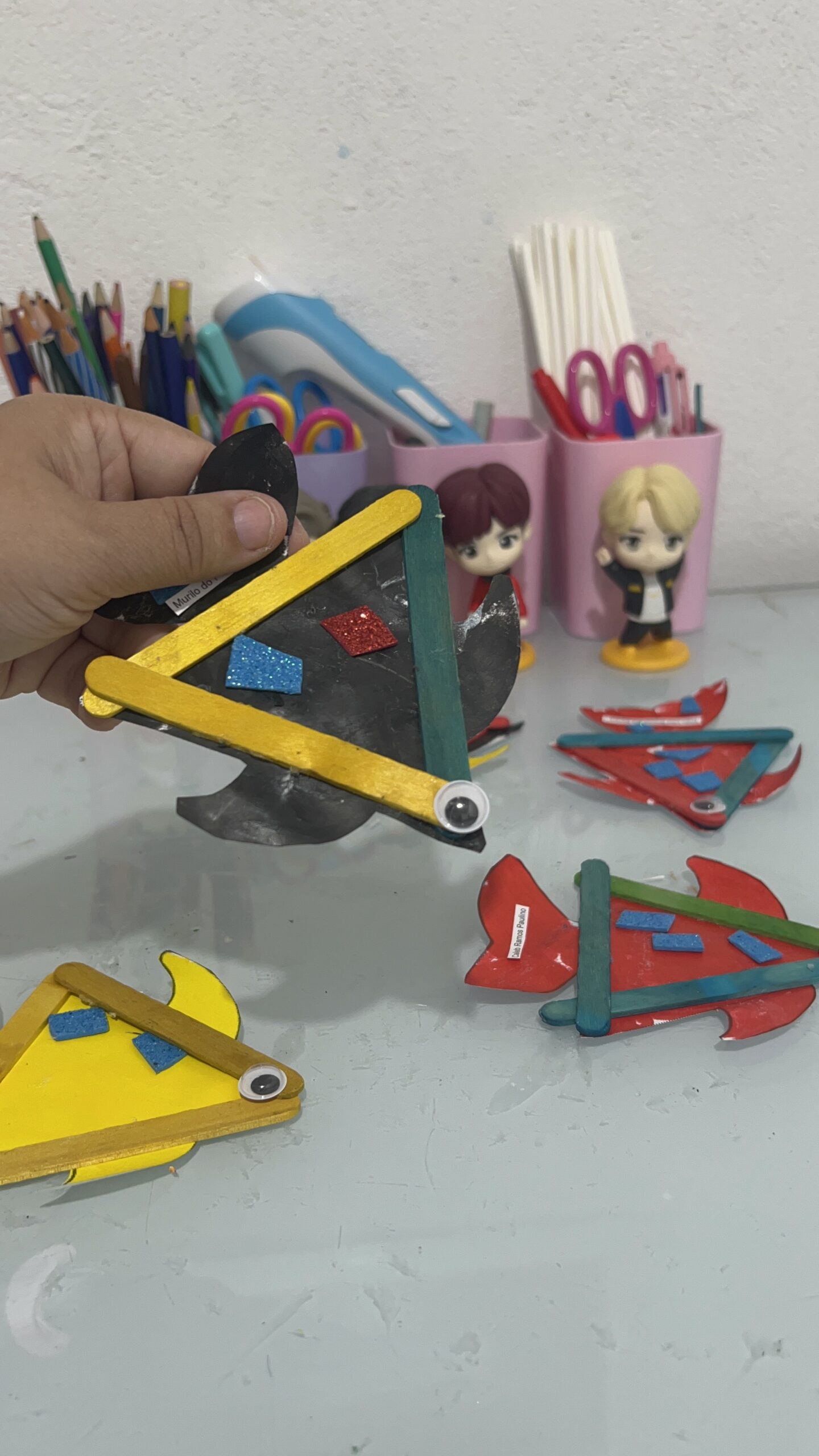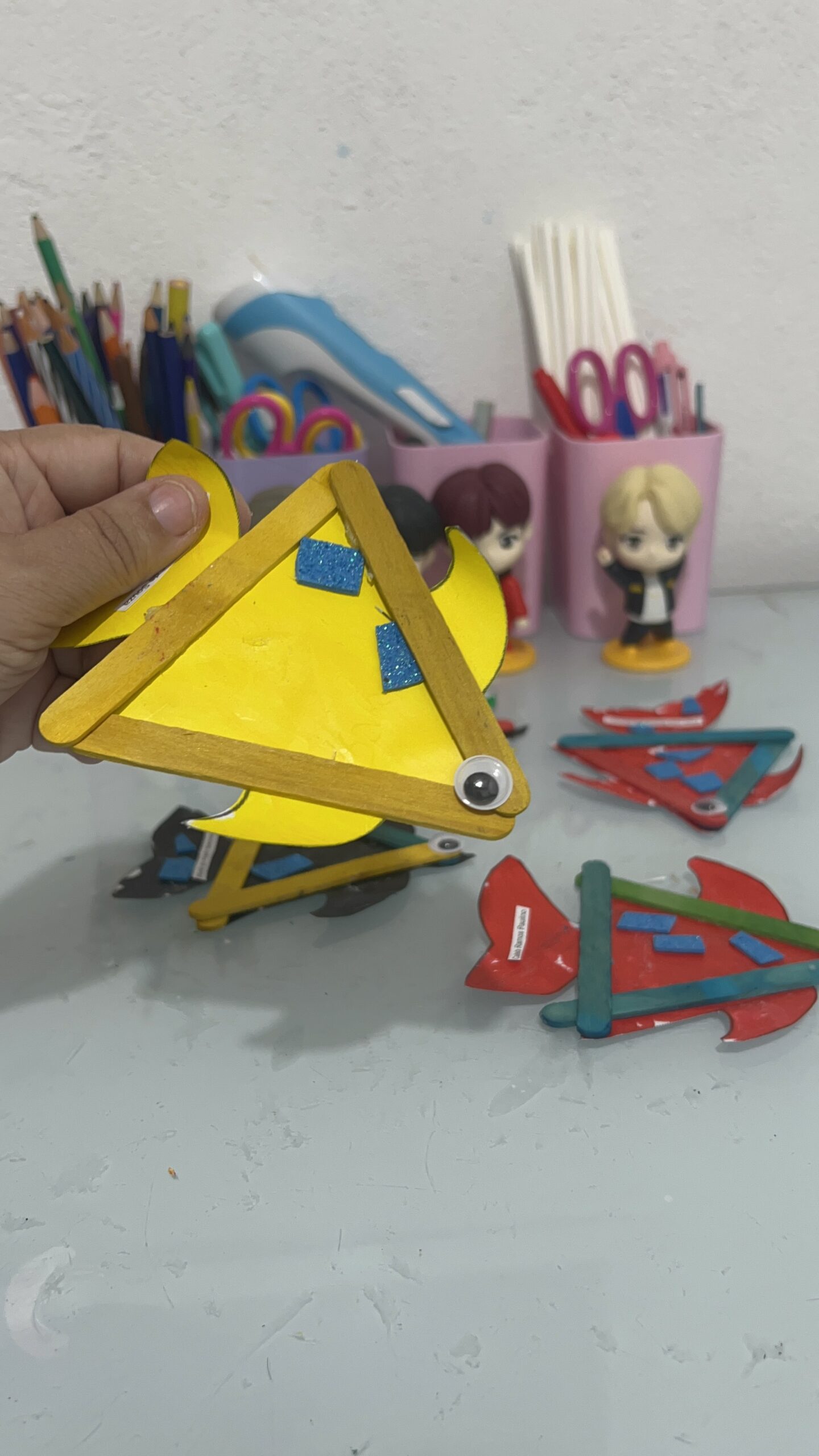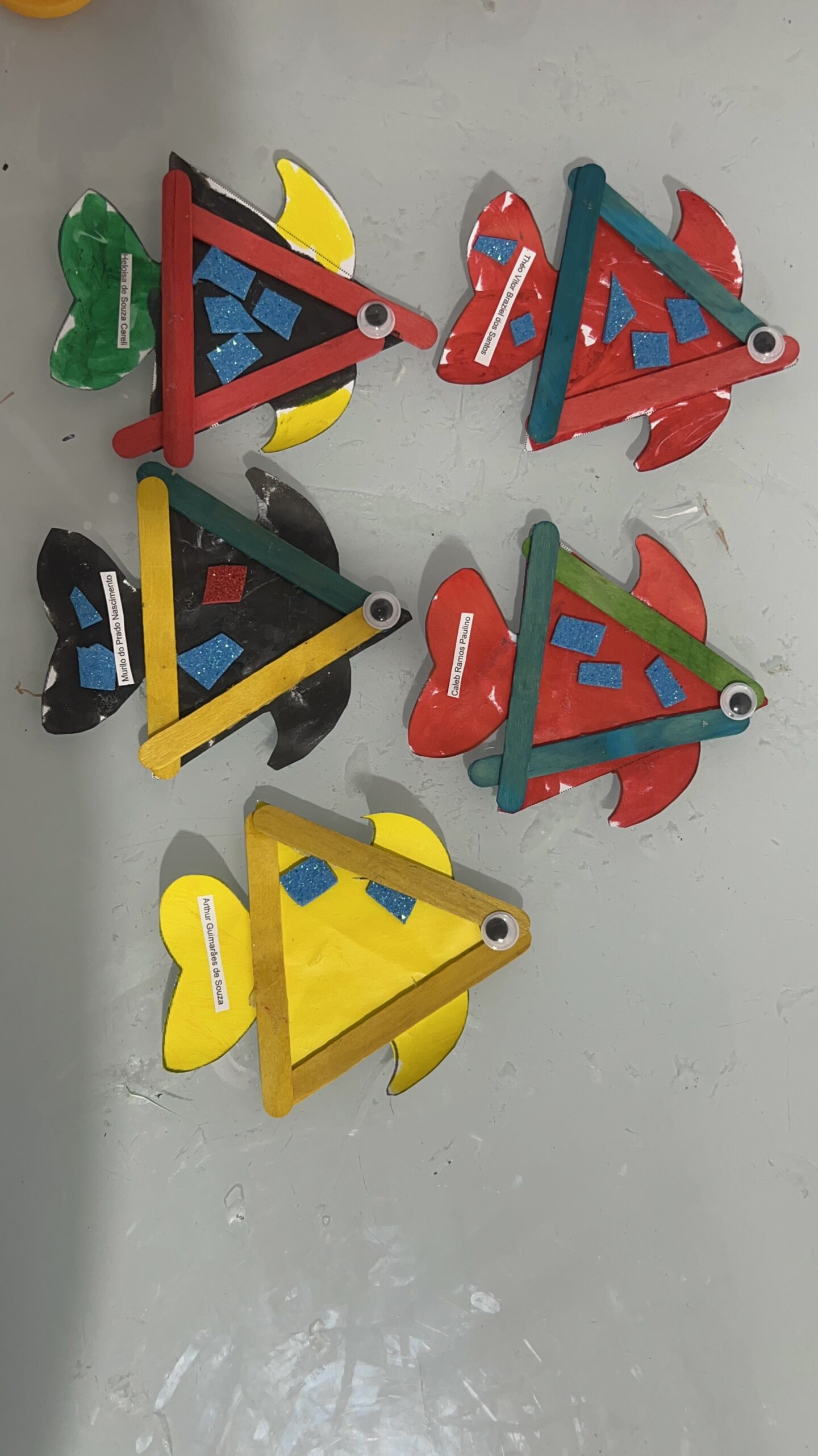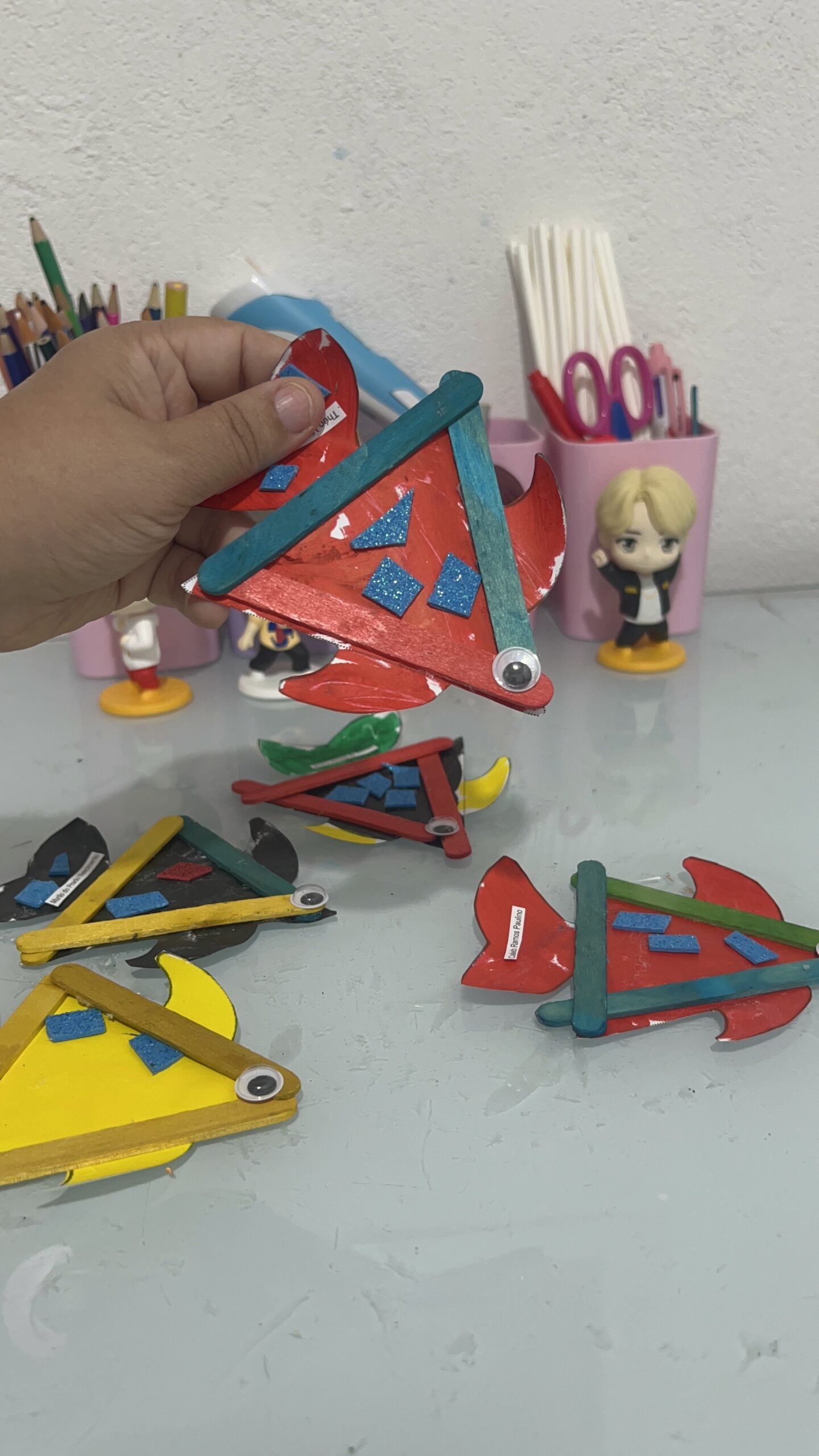 3. Oficina de montagem com palitos de picolé: construção de peixes triangulares com palitos coloridos, olhos móveis e glitter.