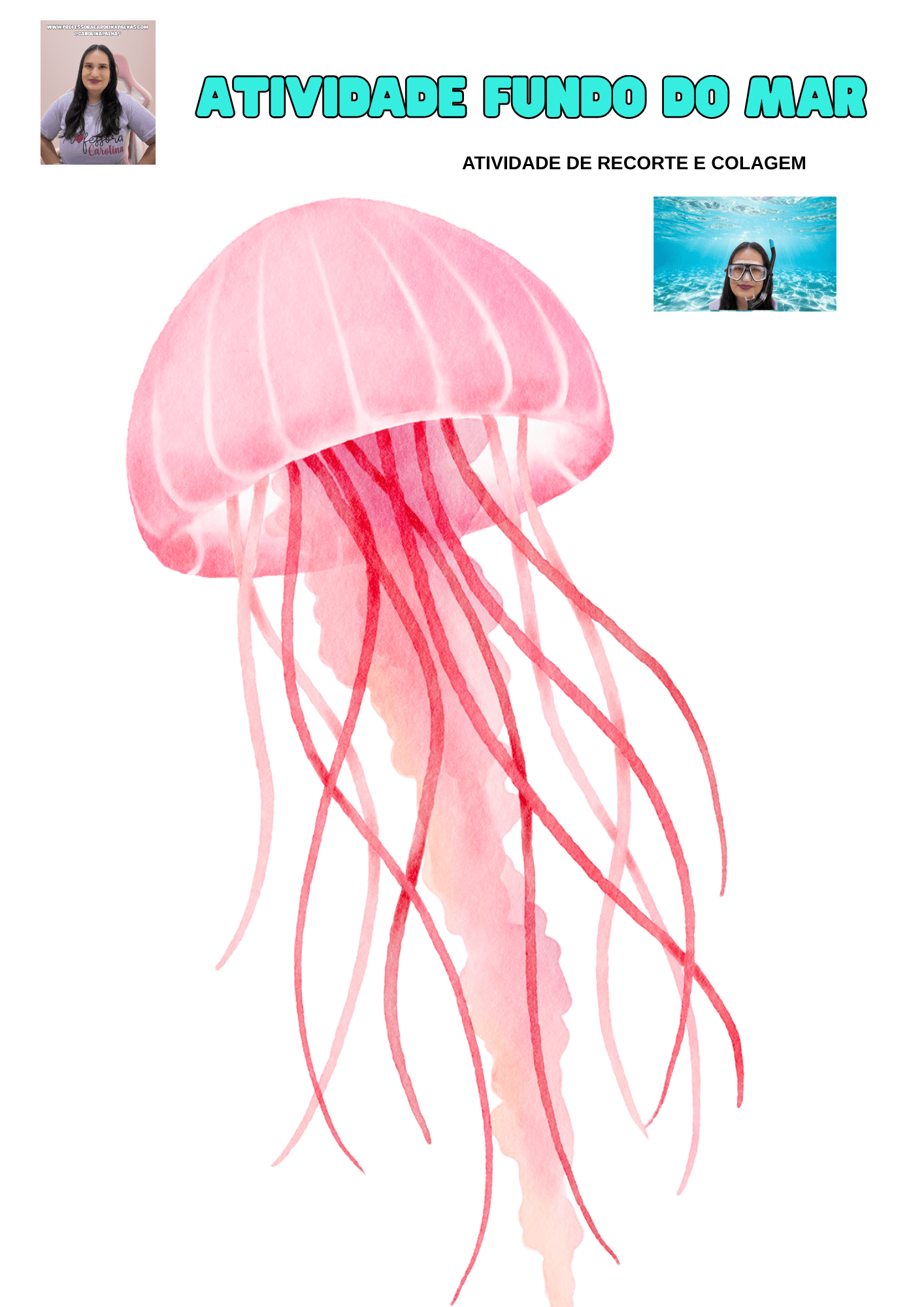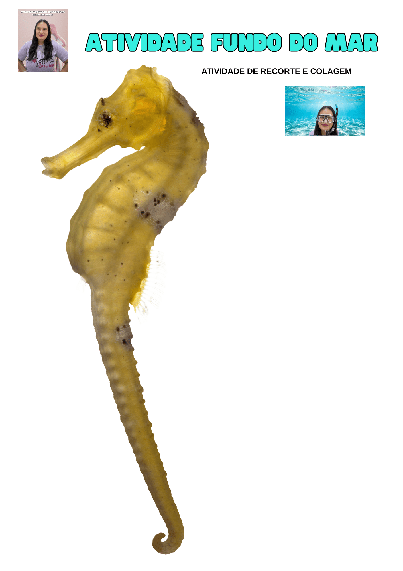- Atividade Principal 2 (Imaginação/Foto): “Mergulhador por um dia”. Faça como em uma das imagens que usei: imprima um fundo do mar em uma folha A4, recorte um espaço para o rosto, e tire fotos das crianças “mergulhando”. Elas amam se ver na cena!