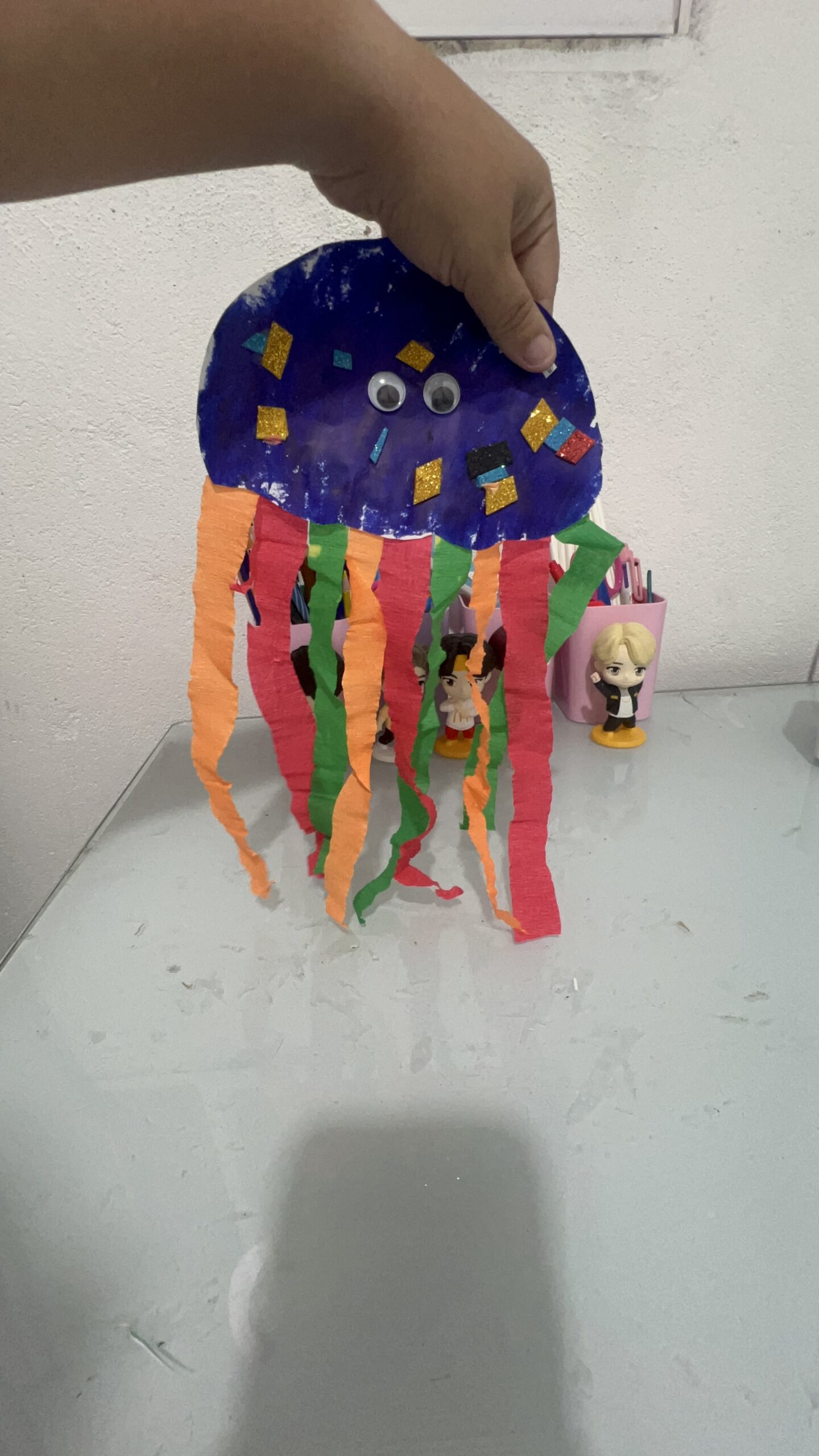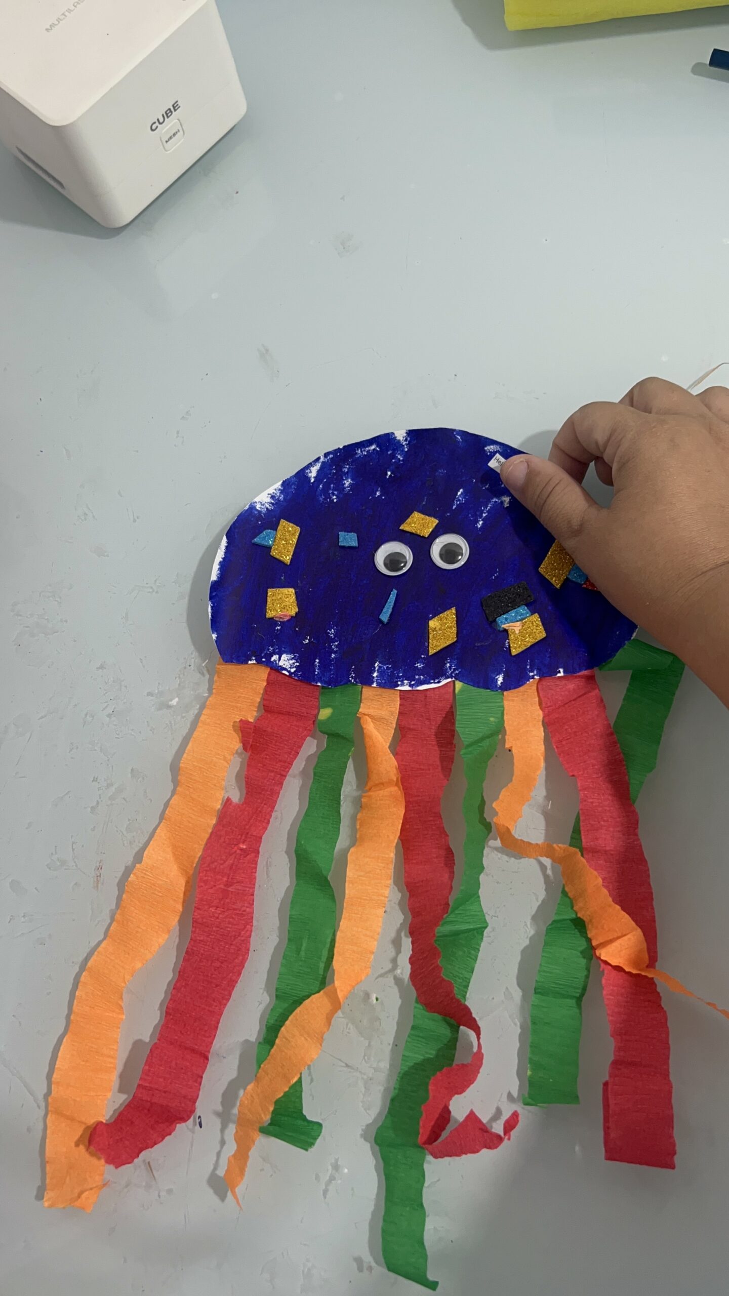 3. Atividade Principal 2 (Arte/Textura): “Água-Viva Sensorial”. Use metade de um prato de papel (ou um círculo de papelão) como o “corpo”. Deixe que pintem e colem pedaços de papel crepom (os tentáculos). O mais legal é amarrar fitas de cetim ou lãs de diferentes texturas para eles sentirem.