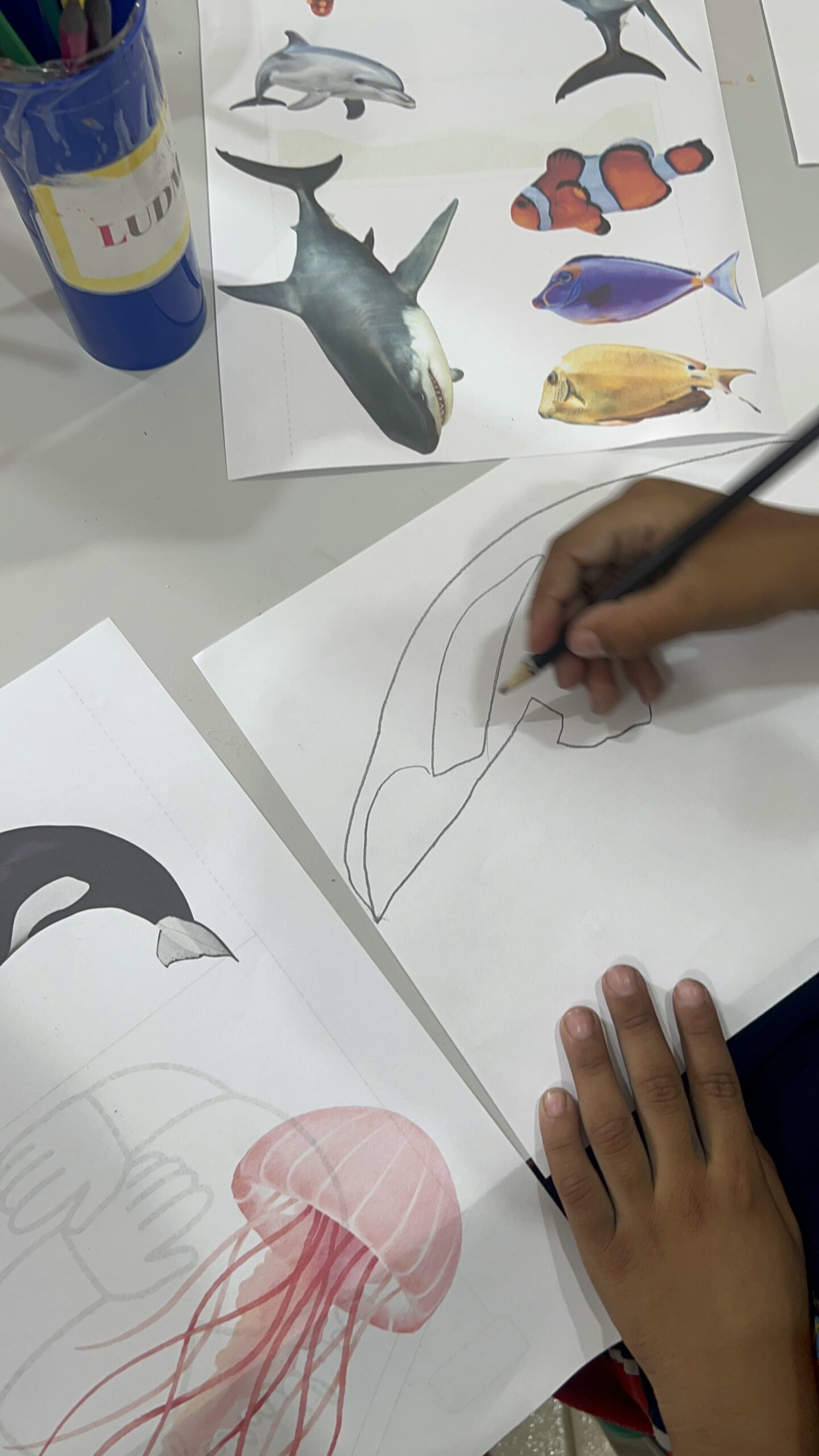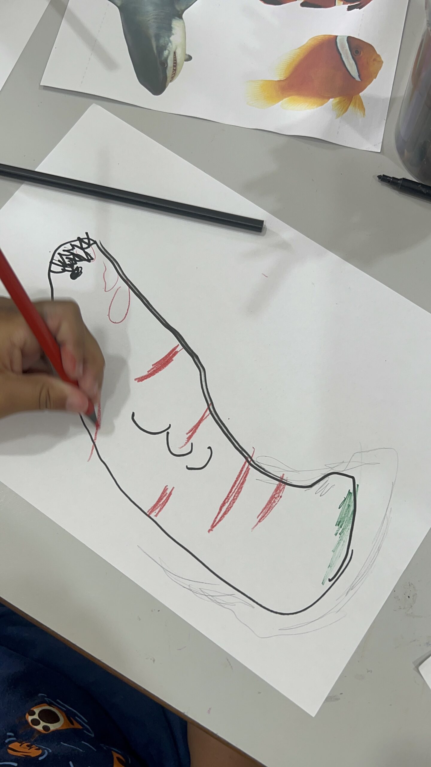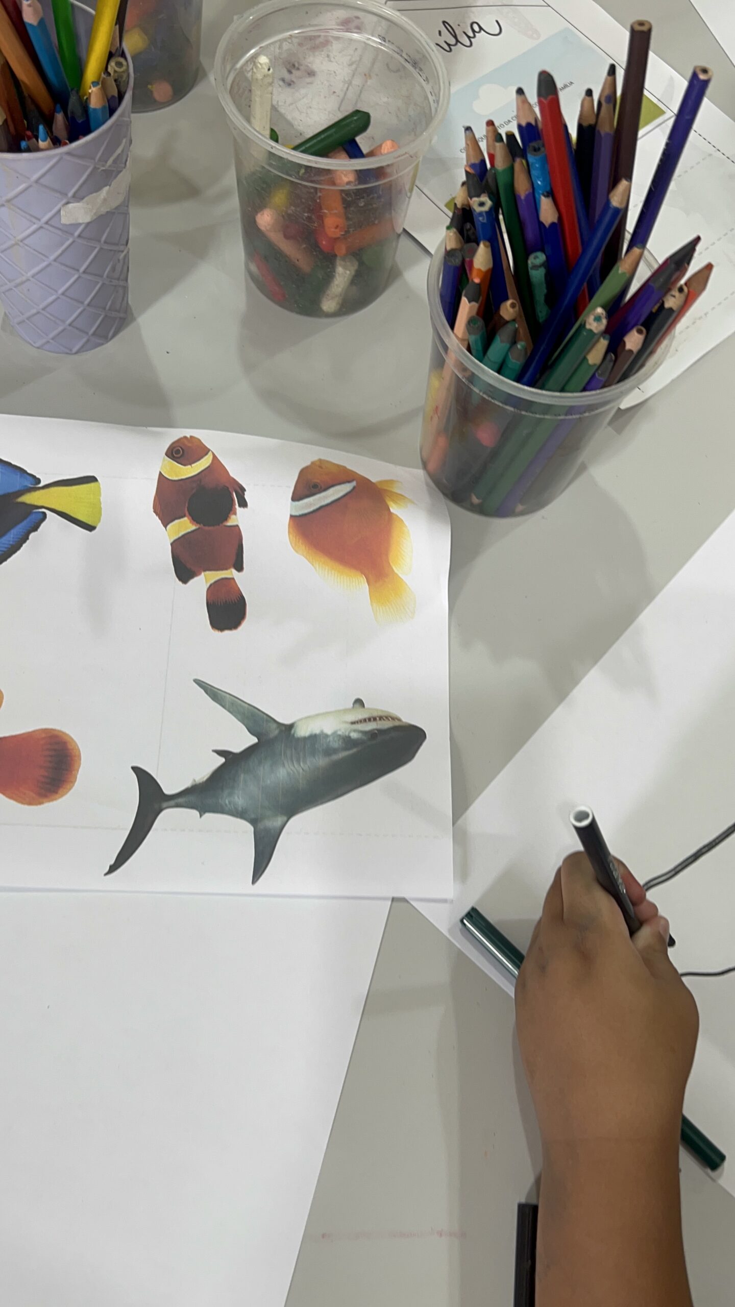 • Habilidades Motoras Finas: Recortar escamas, colar lantejoulas, amassar papel crepom para fazer algas, usar tinta guache em bastão… Cada detalhe é um treino precioso para a futura escrita.