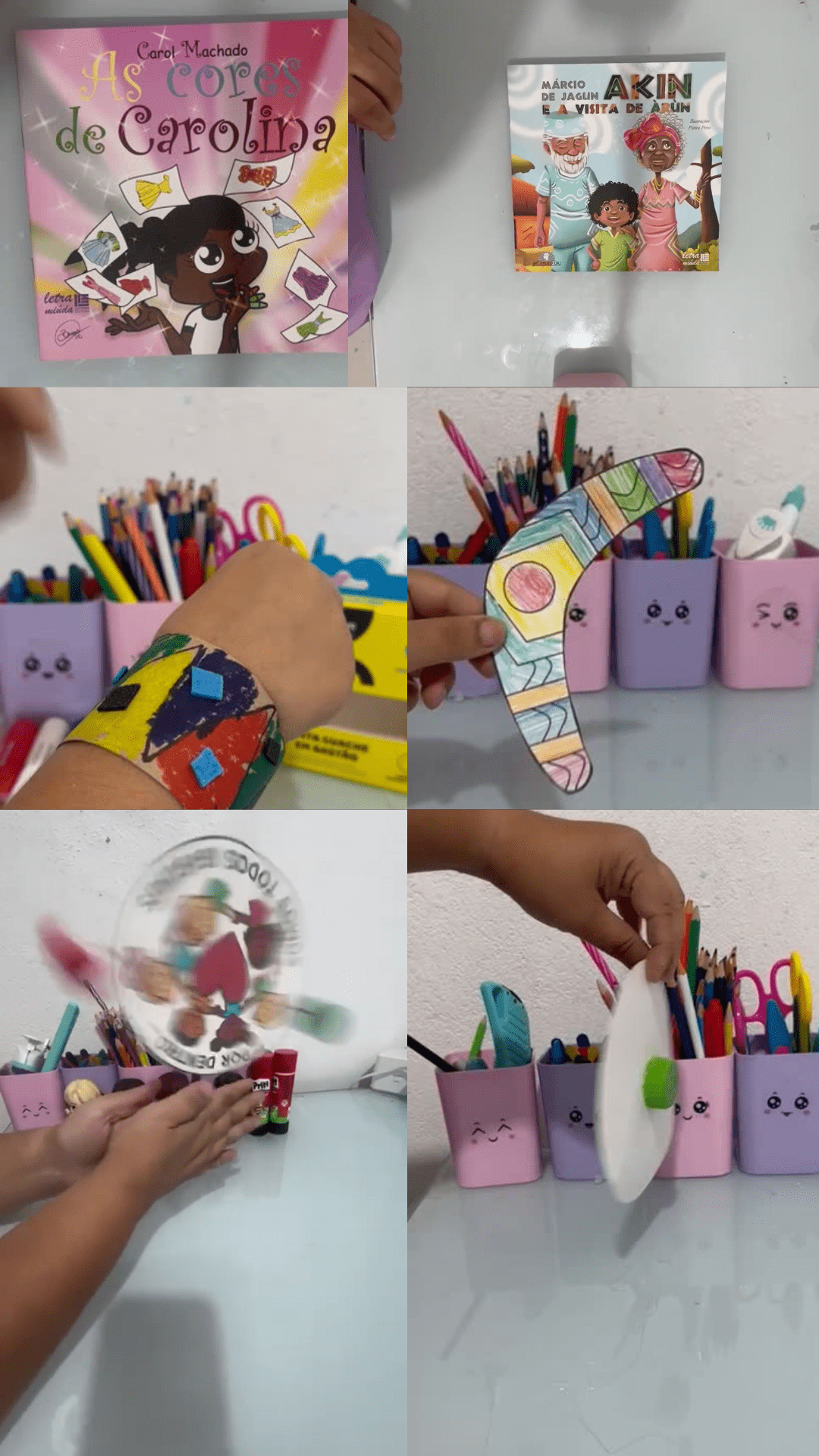 Descrição: na rodinha, cada criança mostra seu desenho e você ajuda a colocar em palavras: “Aqui ele desenhou uma dança…”, “Aqui ela desenhou um cabelo black…”.