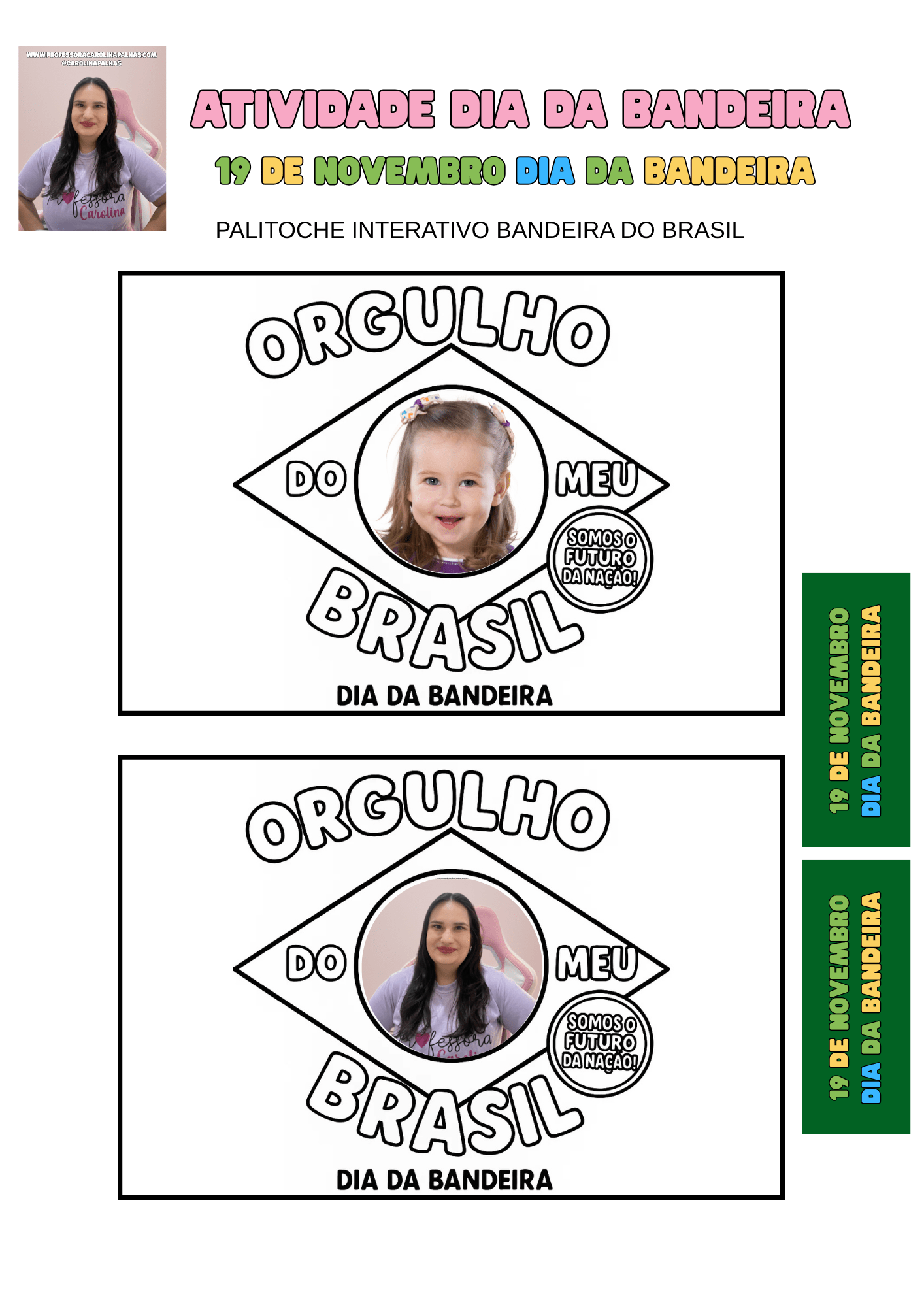 Pensando nisso, criamos um Palitoche Interativo do Dia da Bandeira, totalmente editável no Canva, que permite personalizar a atividade com a foto da própria criança. O resultado é uma experiência encantadora, cheia de identidade, pertencimento e protagonismo infantil.