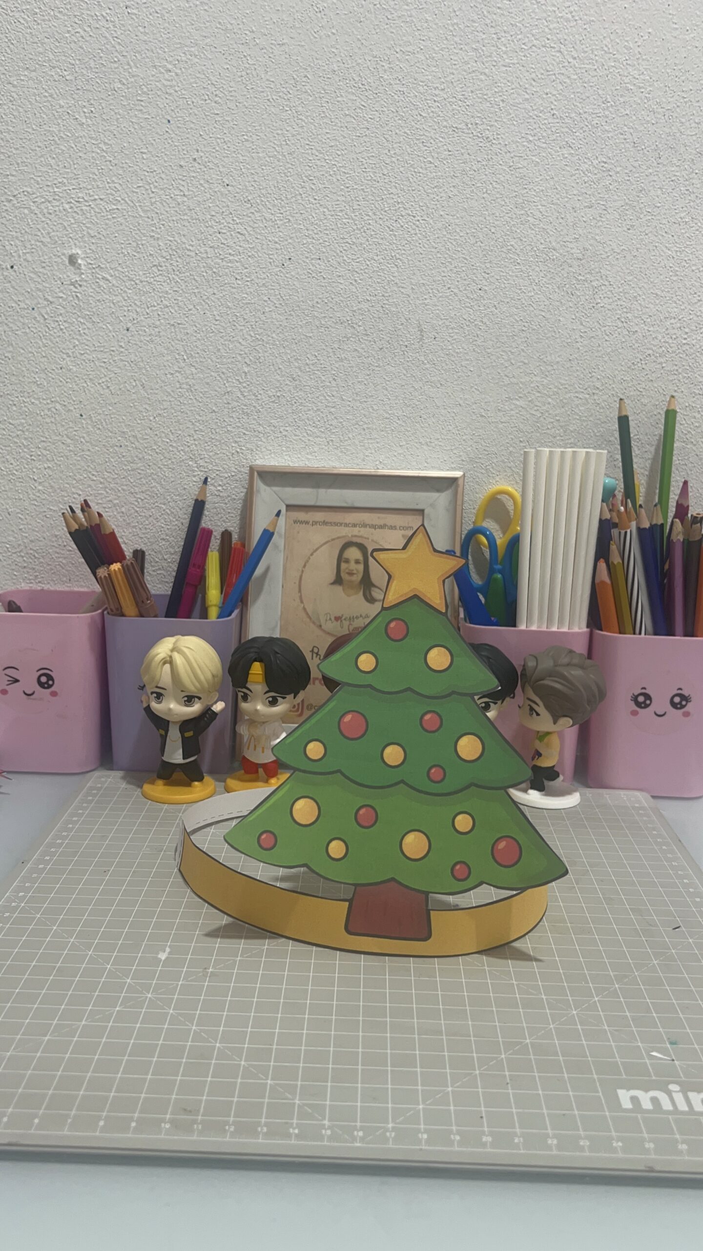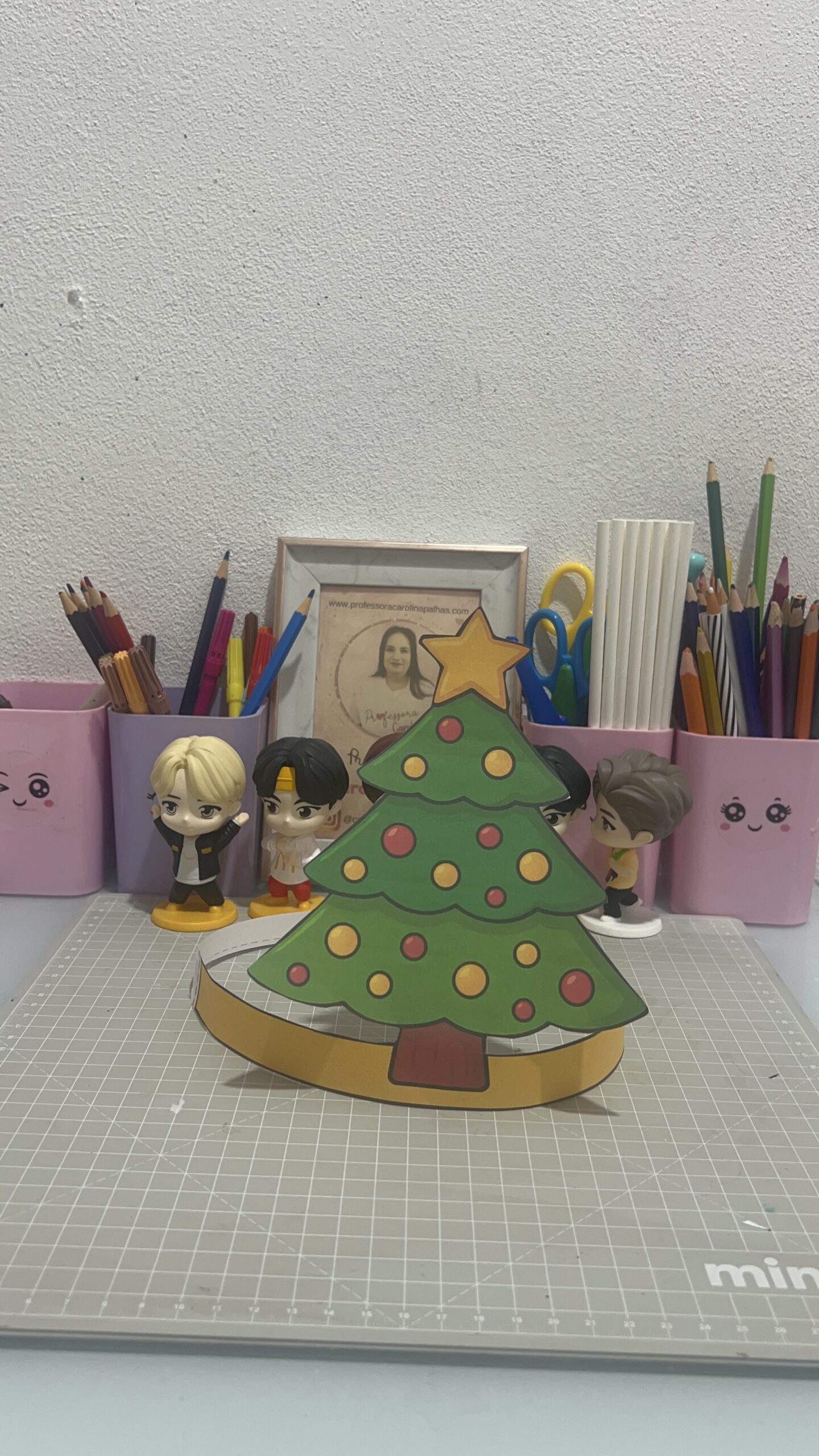 A criança monta sua própria árvore de papel, dobrando, colando e decorando.