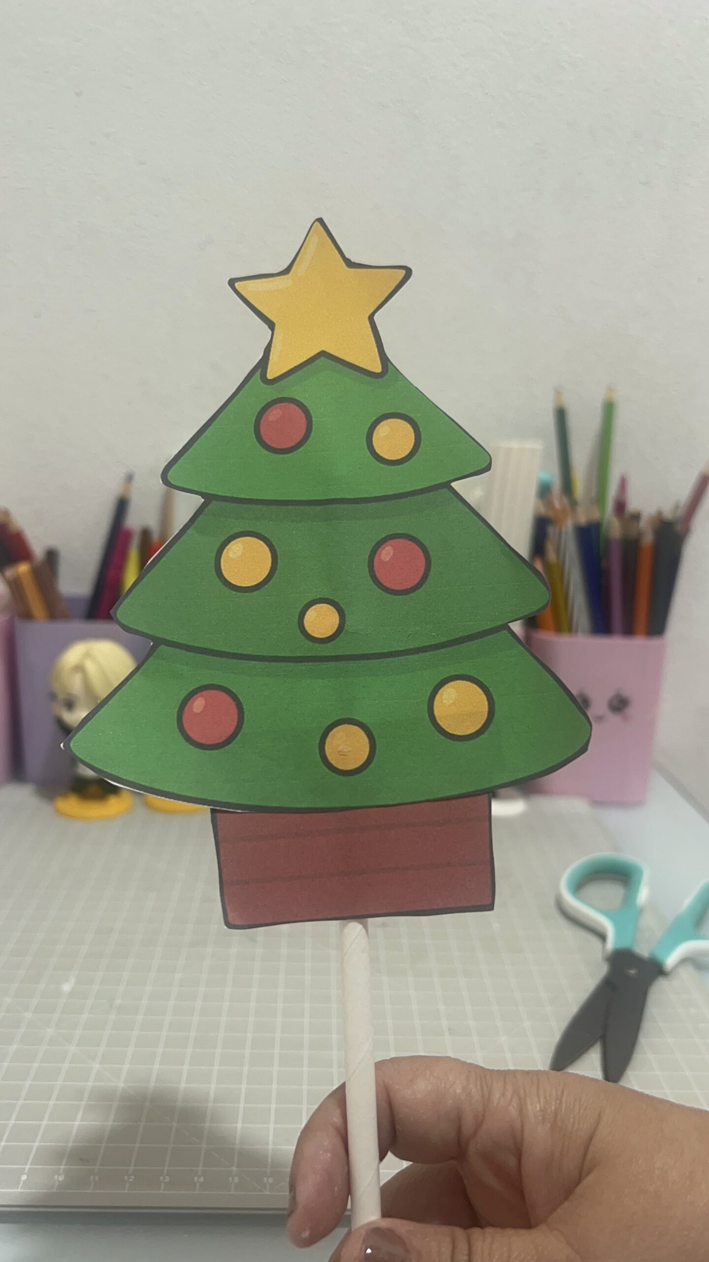 A criança monta sua própria árvore de papel, dobrando, colando e decorando.