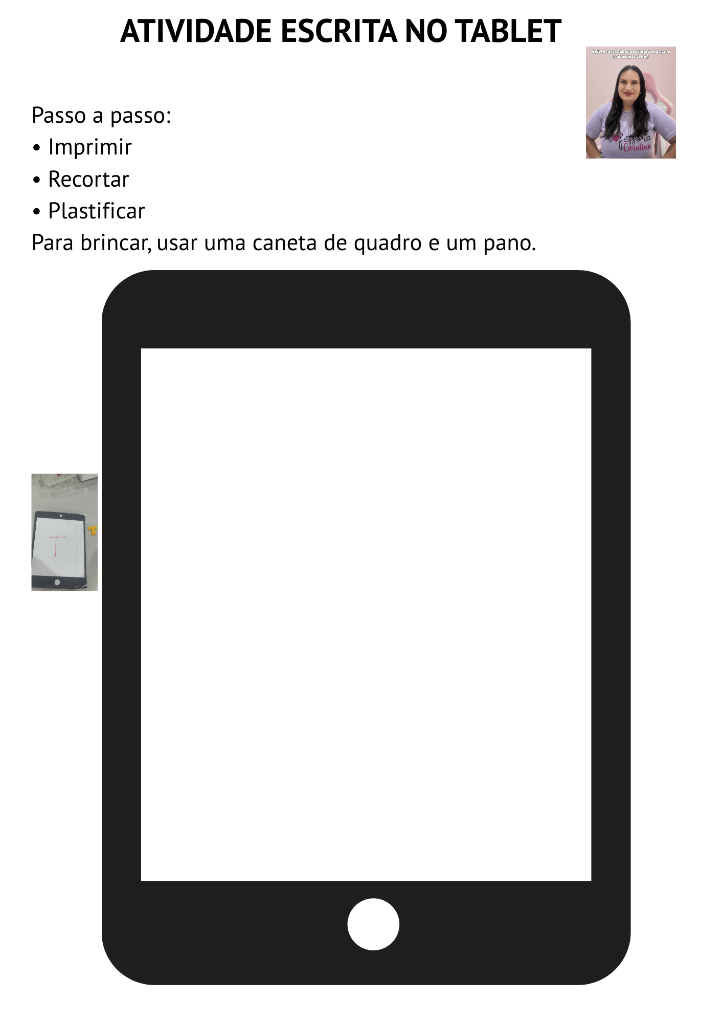 Atividade: Folha plastificada + pincel apagável. A criança desenha letras, números ou formas seguindo modelos.