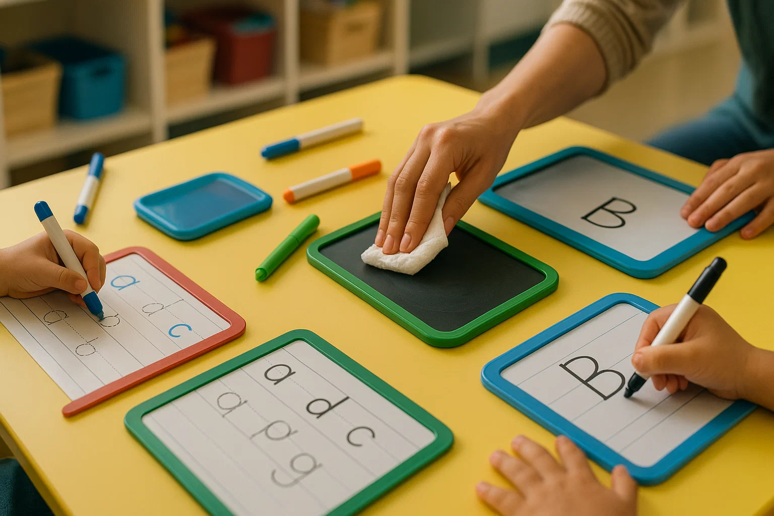 Como apaga rápido, não deixa marca de erro. A criança tenta outra vez, melhora, repete — sem medo.