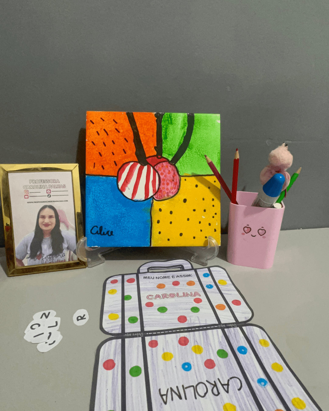 • Descrição: Pintura e colagem do nome com materiais variados (lápis, giz, papel colorido).