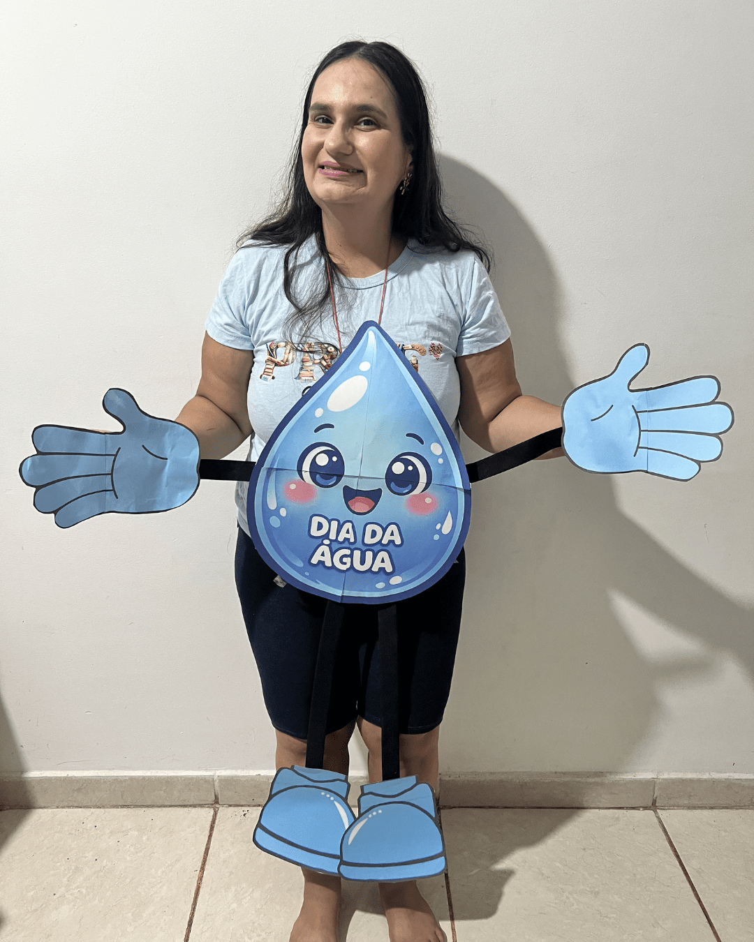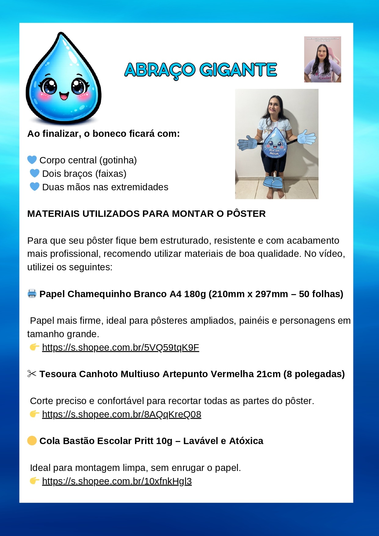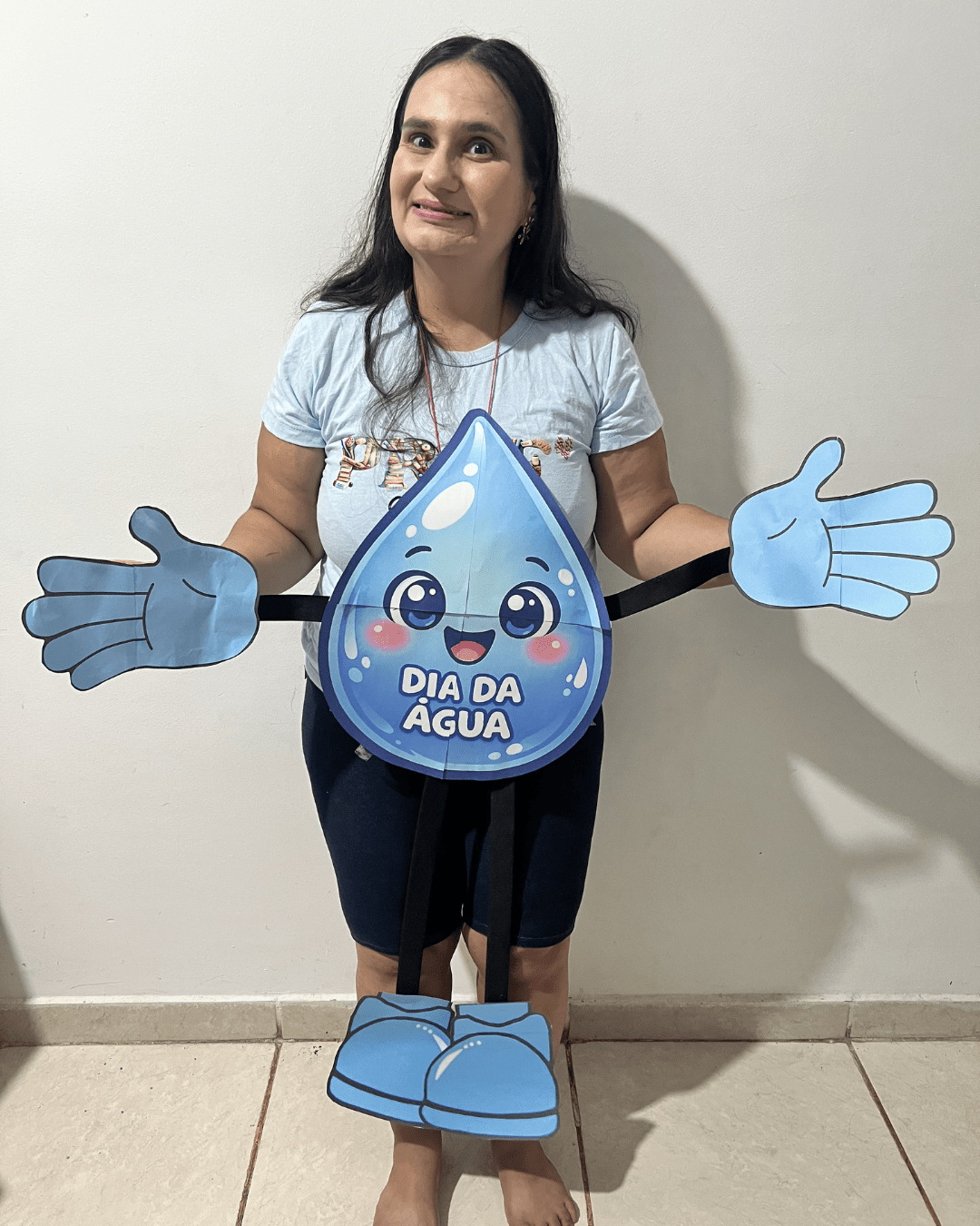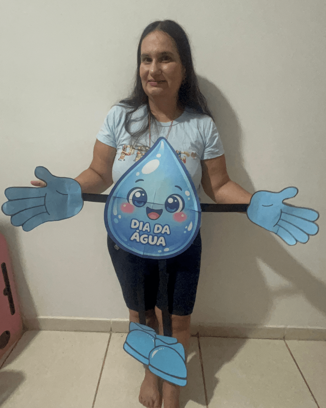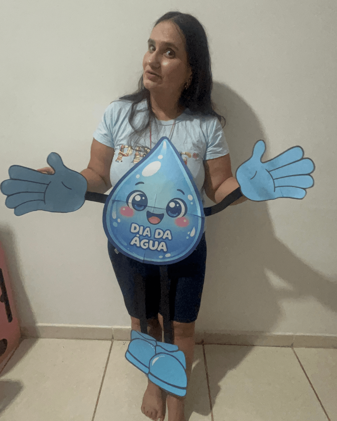 A Gotinha Dançante surge como um recurso pedagógico encantador: um personagem articulado, grande, interativo e cheio de movimento. Ele não é apenas um cartaz. Ele dança, balança, abraça, participa da roda e interage com as crianças. Quando integrado à música “Abraça a Água” (disponível em MP3), o aprendizado ganha ritmo, emoção e significado.