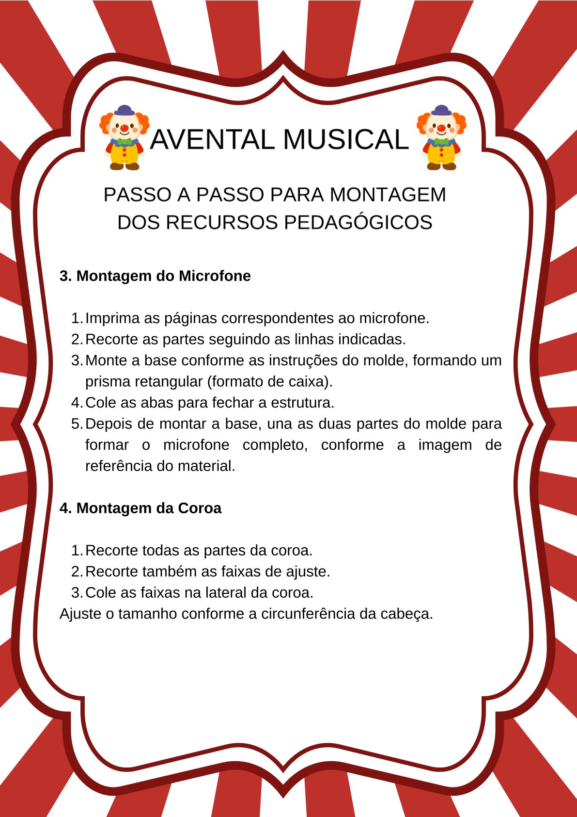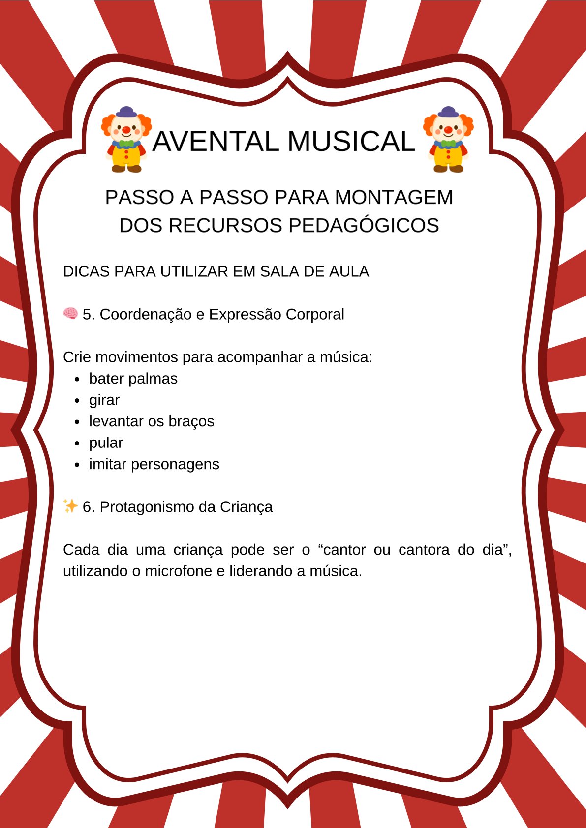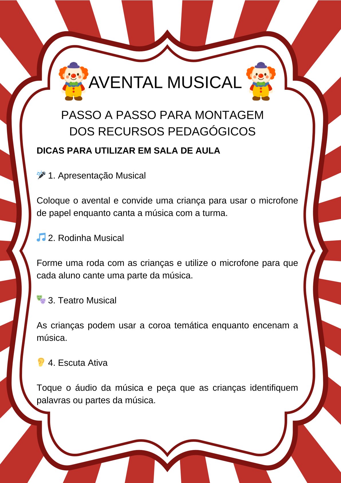 Palavras-chave: avental musical do circo, atividade musical educação infantil, recurso pedagógico circo, musicalização infantil, atividade lúdica educação infantil, projeto circo educação infantil, roda de conversa educação infantil, atividades musicais para crianças, expressão corporal educação infantil, linguagem oral educação infantil, atividades BNCC educação infantil, atividades sobre circo para crianças, recurso pedagógico interativo, musicalização na educação infantil, atividades com música na escola, atividade com fantasia circo, recurso pedagógico para rodinha, atividades lúdicas com música, atividade interativa educação infantil, ideias pedagógicas para professores, atividades criativas para sala de aula, projeto dia do circo educação infantil, atividade musical com movimento, recurso pedagógico circo educação infantil