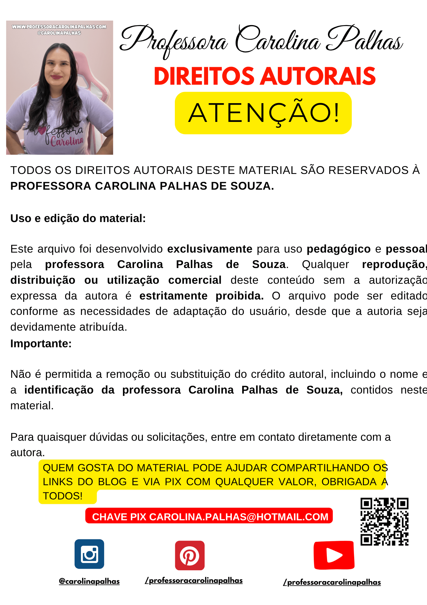 Este material foi produzido exclusivamente por mim. Ele é gratuito e para uso educacional, podendo ser compartilhado apenas através do link desta postagem.